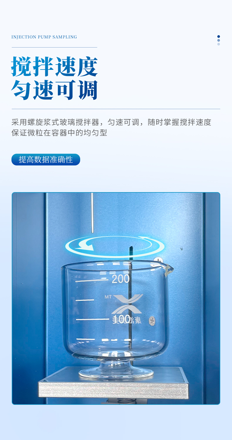 ●采用螺旋漿式玻璃攪拌器,勻速可調,隨時掌握攪拌速度,保證微粒在容器中的均勻型。提高數據準確性。