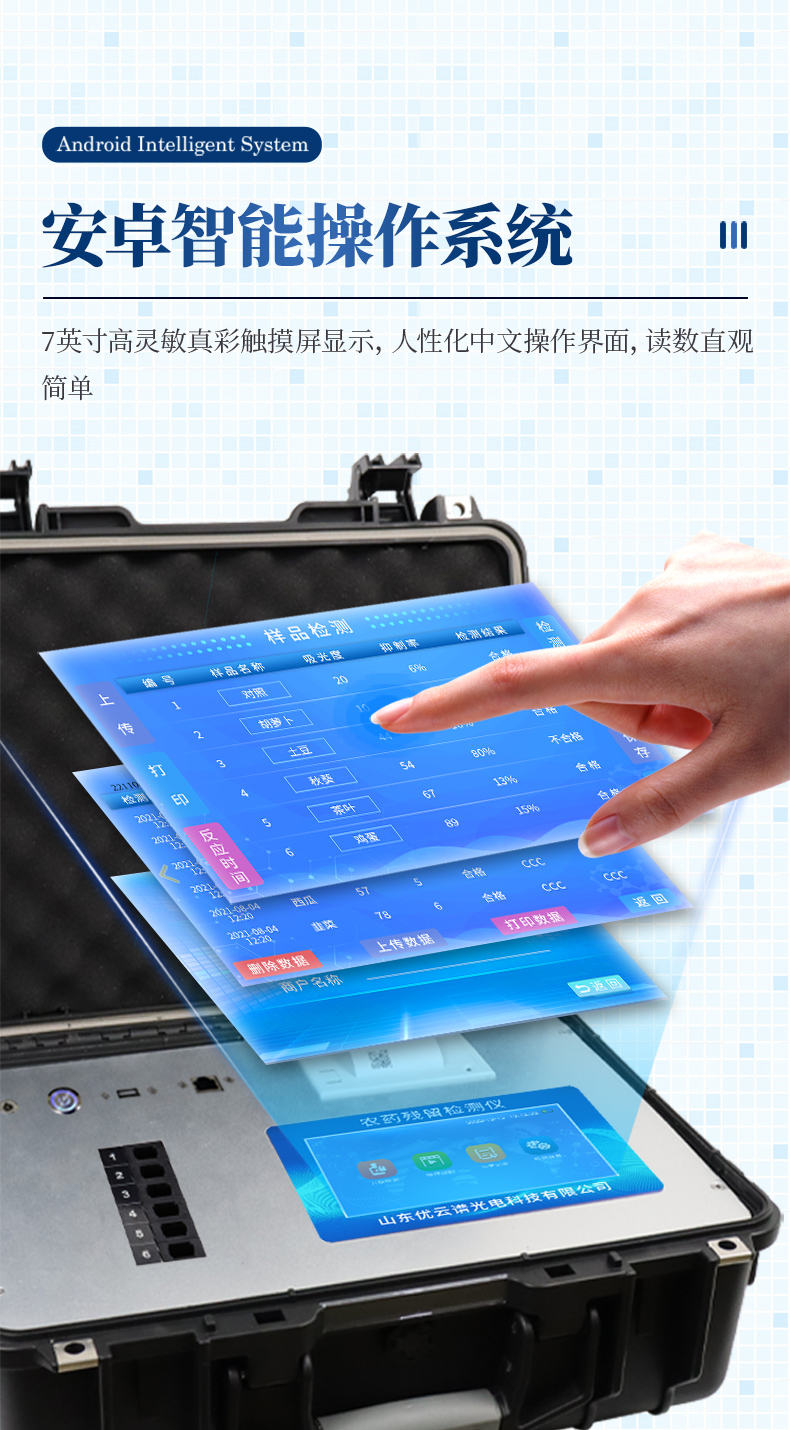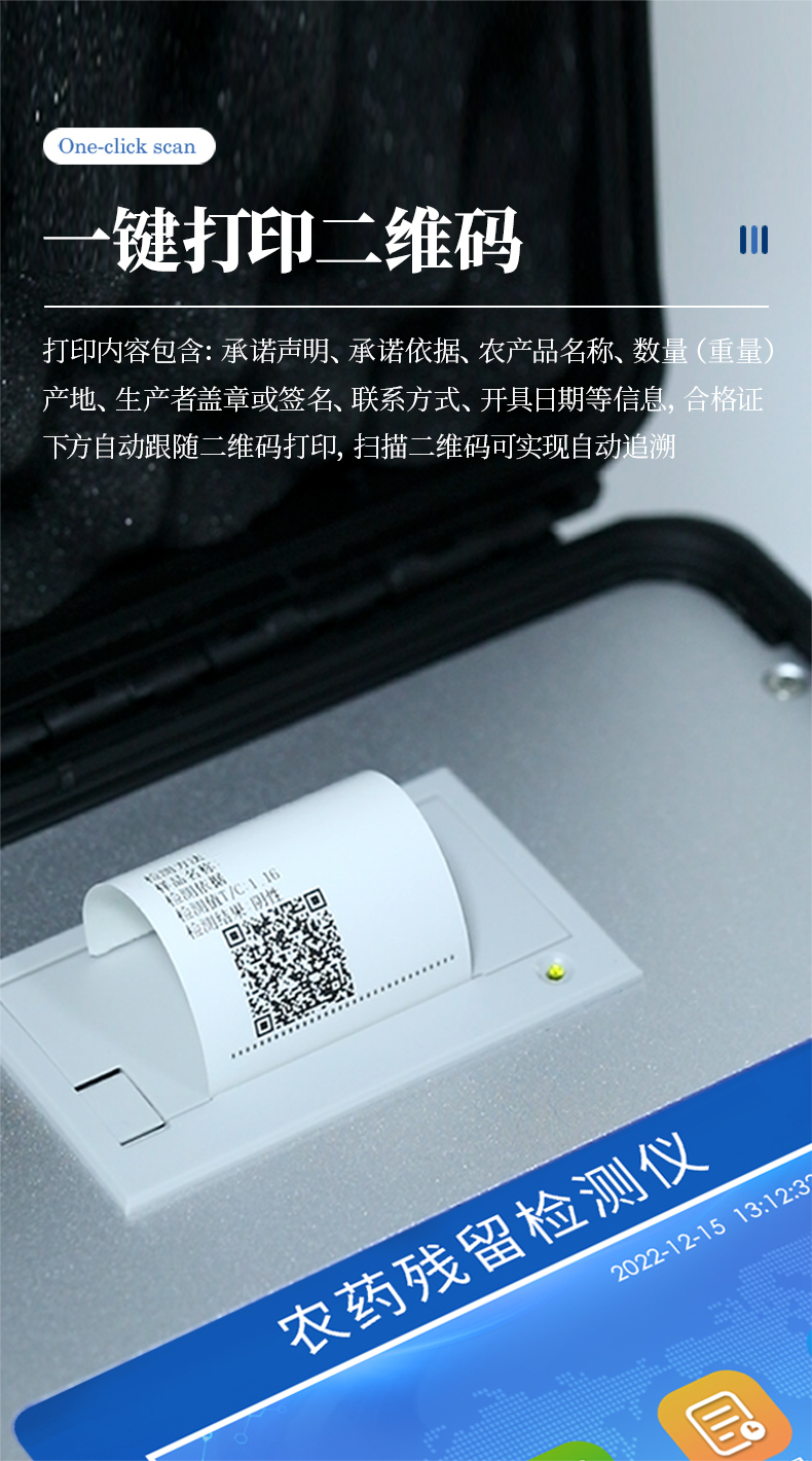山東優云譜光電科技有限公司是一家專業生產食品快檢儀器的高新技術領域企業。我公司根據農村農業部辦公廳關于《加快推進承諾達標合格證制度試行工作的通知》,在原有的食用農產品合格證檢測打印一體機的基礎上優化了打印標簽,使打印標頭和打印內容符合承諾達標合格證的最新要求。該儀器集農藥殘留快速檢測和承諾達標合格證打印于一體,智能化程度高,在快速檢測的同時實現承諾達標合格證的打印。打印內容包含:承諾聲明、承諾依據、農產品名稱、數量(重量)、產地、生產者蓋章或簽名、聯系方式、開具日期等信息,合格證下方自動跟隨二維碼打印,掃描二維碼可實現自動追溯。實現農產品安全的全程數據溯源,適合各地檢測機構、農業合作社、蔬菜批發市場等單位使用。