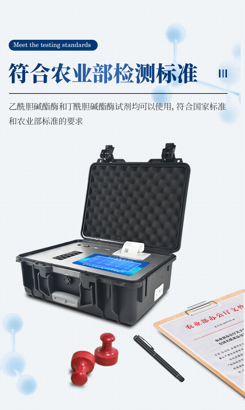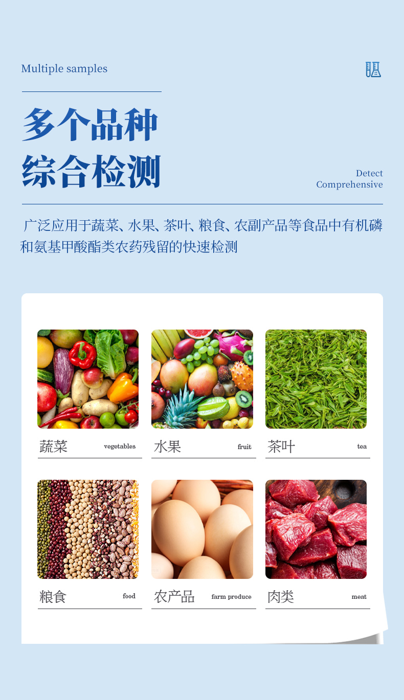 廣泛應用于蔬菜、水果、茶葉、糧食、農副產品等食品中有機磷和氨基甲酸酯類農藥殘留的快速檢測;此外還可用于果蔬茶生產基地和農貿批發銷售市場現場檢測,餐館、學校、食堂、家庭果蔬加工前的安全速測等。
