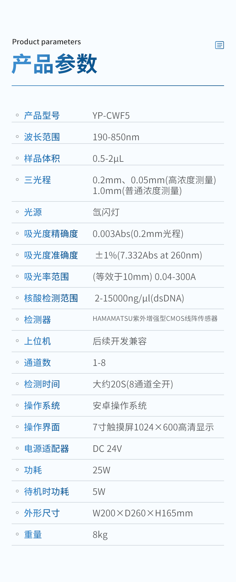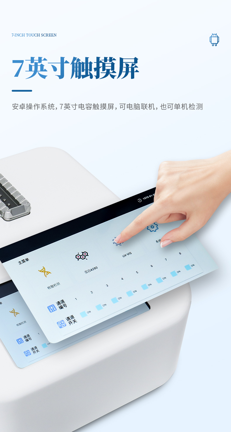 超微量紫外可見分光光度計單機和PC全部兼備的1-8可任意開啟的多通道全波長(190-850NM)微量分光光度計??煽焖贉蚀_的檢測核酸、蛋白質和細胞溶液,核酸檢測每次測量所需要的樣品量僅需1至2UL即可。直接將樣品點于加樣臺上。無需比色杯或毛細管等附件。測量結束后,可以選擇直接將樣品擦去或者再用移液器回收樣品。所有步驟簡單快速,一氣呵成。可應用在臨床疾病診斷、輸血安全、法醫學鑒定、環境微生物檢測、食品安全檢測、分子生物學研究等多種領域。