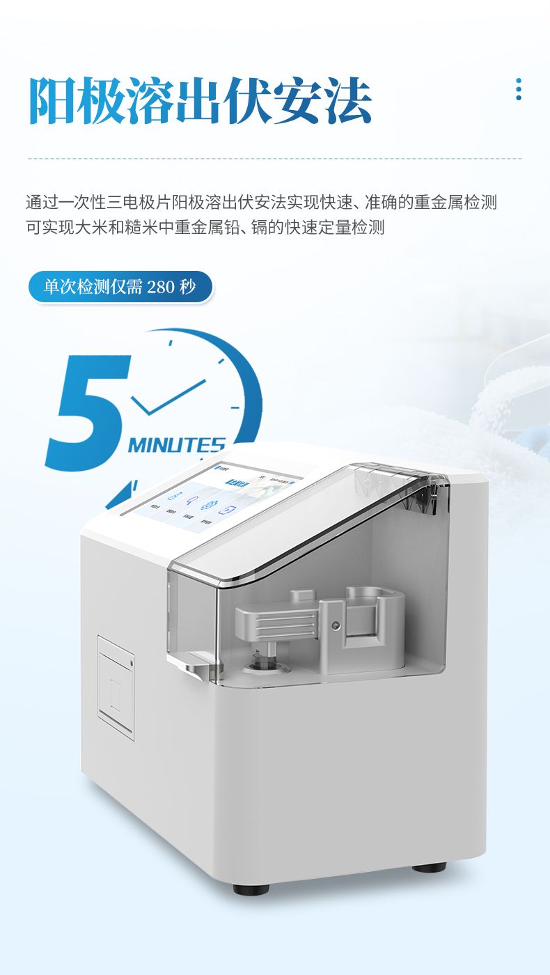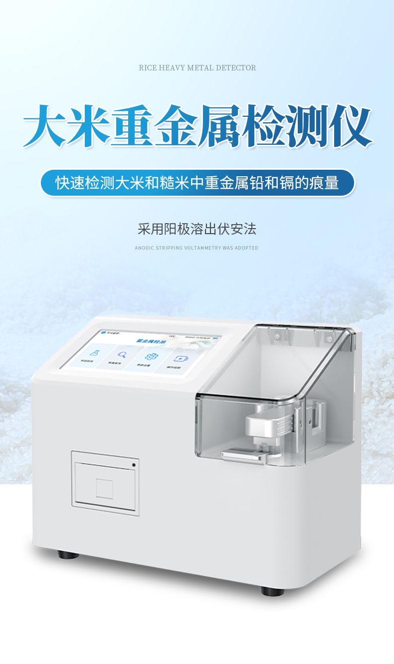 伏安法重金屬檢測儀(糧食重金屬速測儀)是一款高精度的電化學分析設備,專用于檢測大米和糙米中重金屬鉛、鎘的含量。該儀器通過一次性三電極片陽極溶出伏安法實現快速、準確的重金屬檢測,配合絲網印刷電極耗材和簡易的樣本前處理方式,可實現大米和糙米中重金屬鉛、鎘的快速定量檢測。