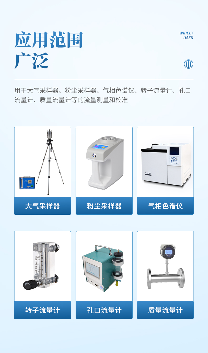 可用于大氣采樣器、粉塵采樣器、氣相色譜儀、轉子流量計、孔口流量計、質量流量計等的流量測量和校準。