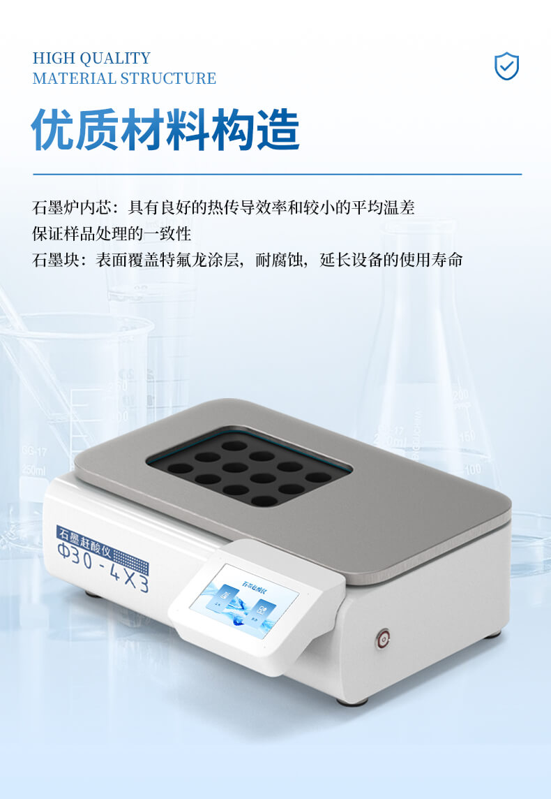 采用優質石墨爐內芯,平均溫差較小,樣品效果一致性好,熱傳導效率更高。石墨塊具有特氟龍涂層,耐腐蝕,延長使用壽命。