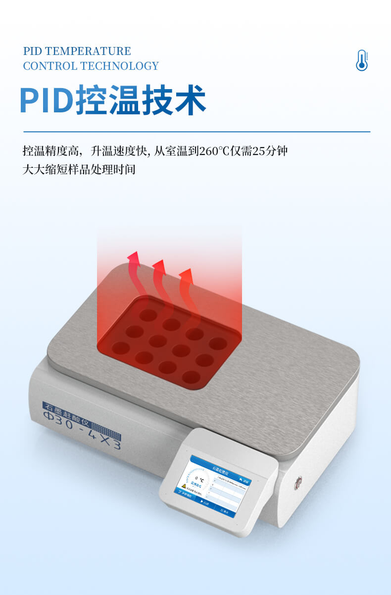 采用PID 控溫技術,控溫精度高,升溫速度快, 從室溫到260℃僅需25分鐘。