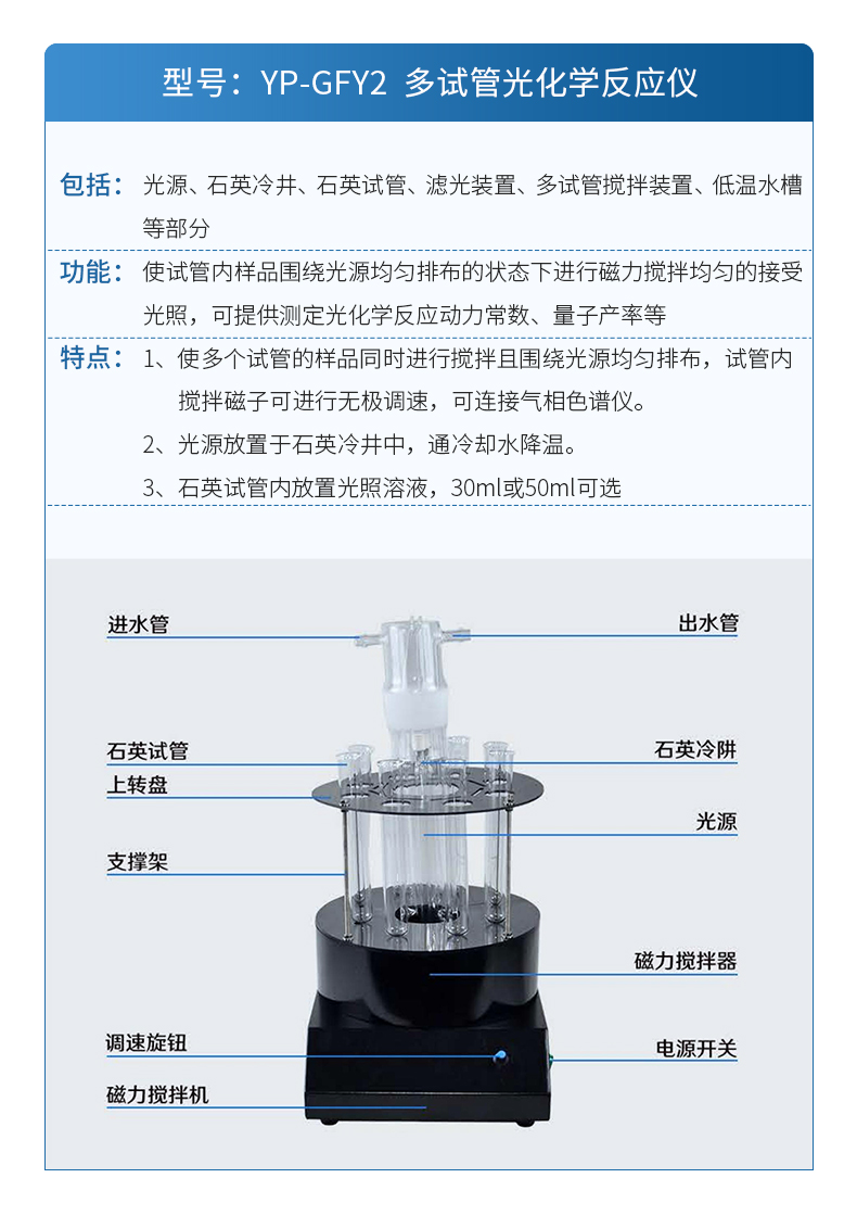 | 包括:光源、石英冷井、大容量反應(yīng)容器、大容量磁力攪拌裝置、低溫水槽、冷凝管、磨口溫度計等部分。 功能:使大容量反應(yīng)器內(nèi)樣品圍繞光源均勻排布的狀態(tài)下進(jìn)行磁力攪拌均勻的接受光照,可提供測定光化學(xué)反應(yīng)動力和反應(yīng)速率,提供分析反應(yīng)產(chǎn)物和自由基的樣品等。 特點:1、使多個試管的樣品同時進(jìn)行攪拌且圍繞光源均勻排布,試管內(nèi)攪拌磁子可進(jìn)行無極調(diào)速。 2、反應(yīng)器附有石英冷井插口、冷凝管插口、溫度計插口、通氣插口 3、反應(yīng)器規(guī)格250ml、500ml、1000ml三種規(guī)格可選。 4、光源放置于石英冷井中,通冷卻水降溫。 5、攪拌裝置加熱和不加型可選。 |