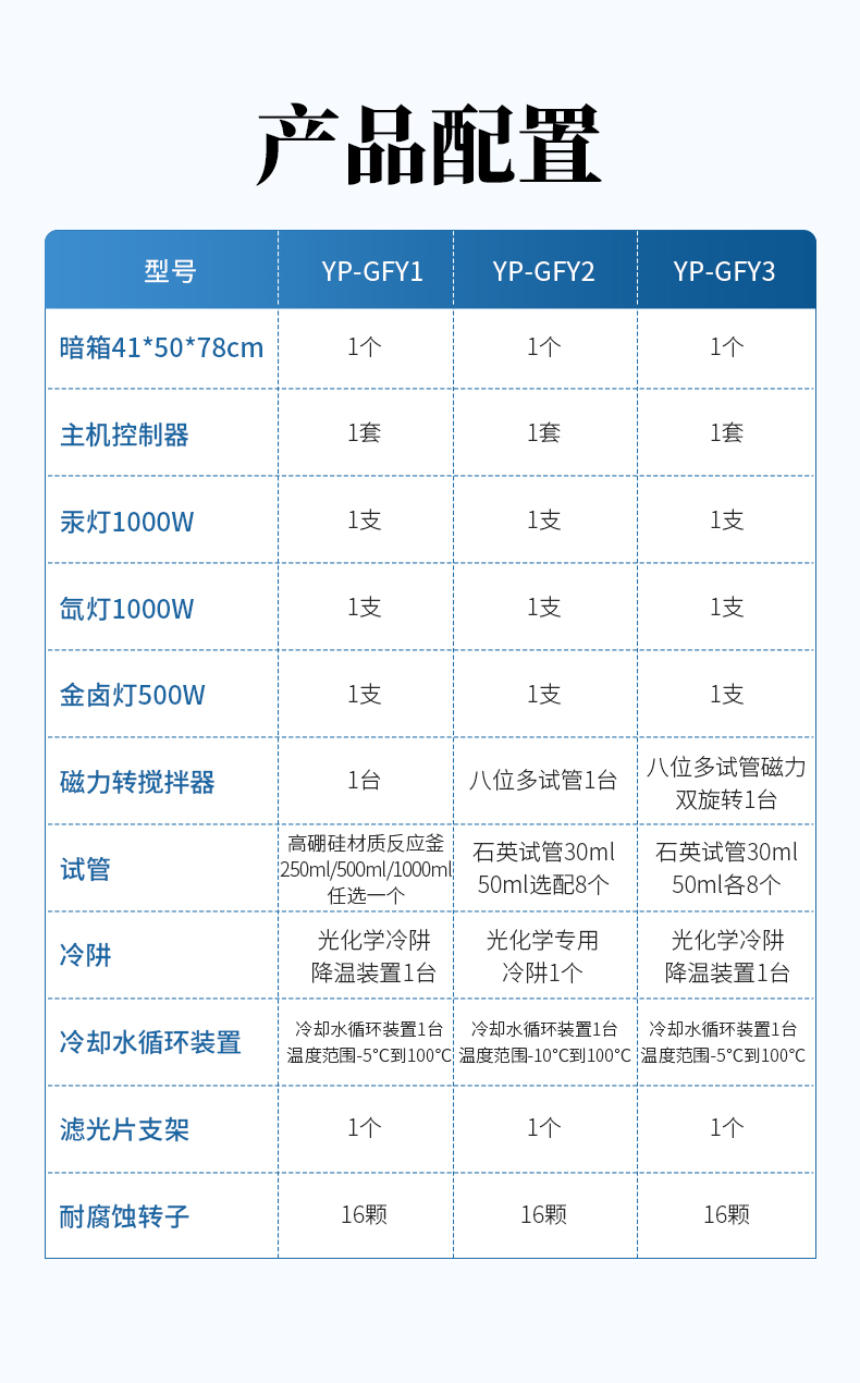 YP-GFY2 多試管反應器包括:光源、石英冷井、石英試管、濾光裝置、多試管攪拌裝置、低溫水槽等部分。 功能:使試管內樣品圍繞光源均勻排布的狀態下進行磁力攪拌均勻的接受光照,可提供測定光化學反應動力常數、量子產率等 特點:1、使多個試管的樣品同時進行攪拌且圍繞光源均勻排布,試管內攪拌磁子可進行無極調速,可連接氣相色譜儀。 2、光源放置于石英冷井中,通冷卻水降溫。 3、石英試管內放置光照溶液,30ml或50ml可選