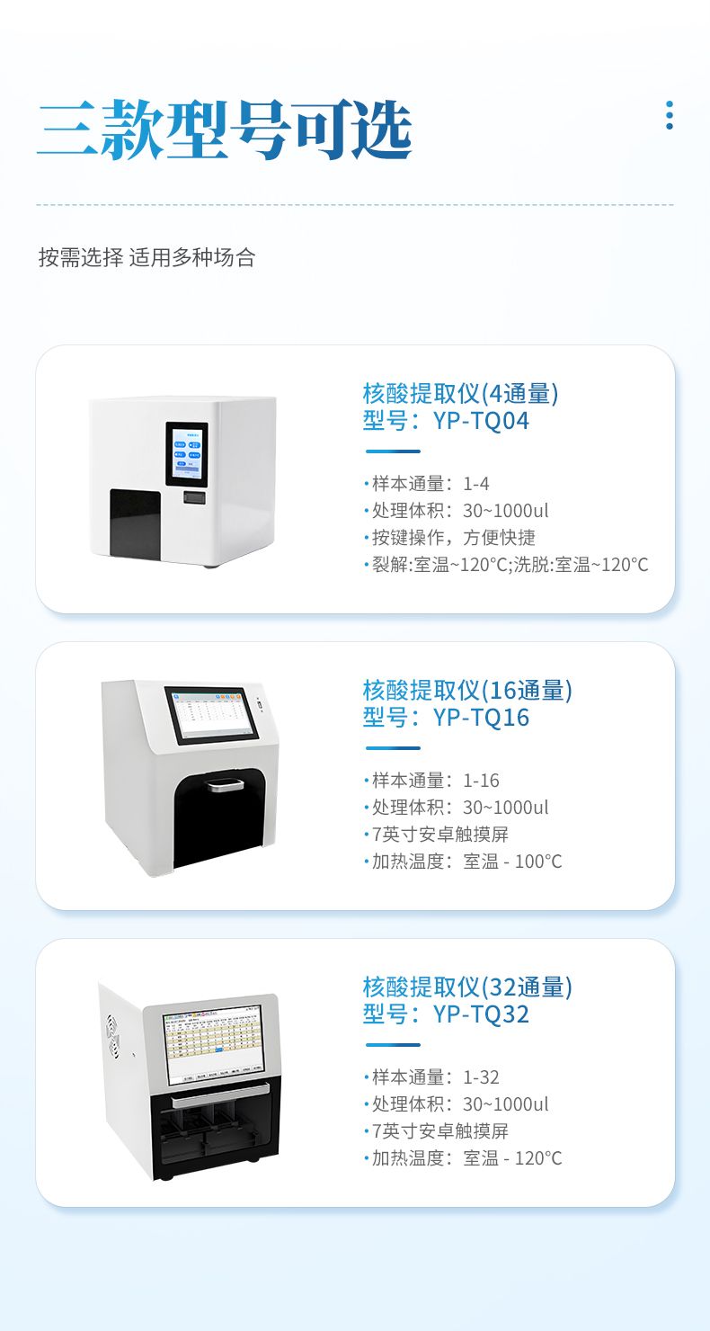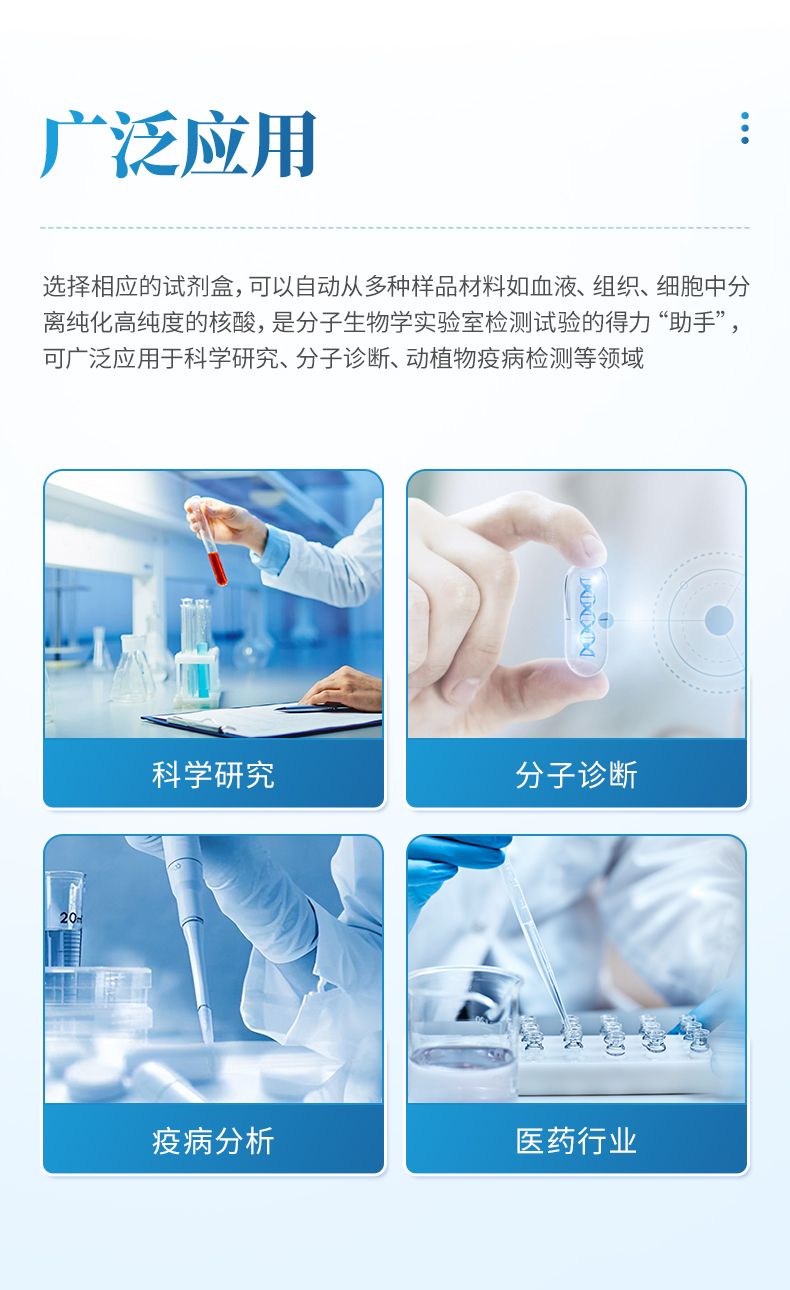核酸提取儀通過磁珠法提取核酸,選擇相應的試劑盒就可以自動的從多種樣品材料如血液、組織、細胞中分離純化高純度的核酸。具有兼容性強(適配預封裝提取試劑盒,也可適配單頭份試劑)、提取速度快、提取回收率高、操作簡便的優點,是分子生物學實驗室檢測試驗的得力“助手”。可廣泛應用于科學研究、分子診斷、動植物疫病檢測等領域。
