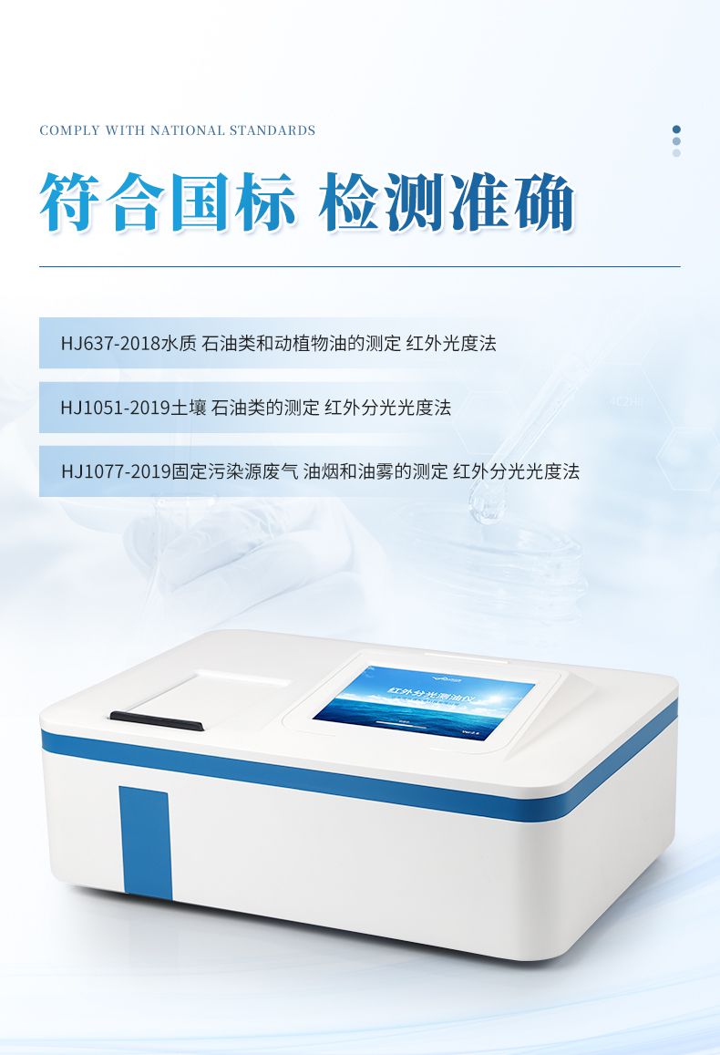 紅外分光測油儀是根據中國環境保護標準《HJ637-2018水質石油類和動植物油的測定 紅外分光光度法》、《HJ1051-2019土壤石油類的測定 紅外分光光度法》、《HJ1077-2019固定污染源廢氣 油煙和油霧的測定 紅外分光光度法》進行研發制造,該儀器主要檢測地表水、地下水、工業廢水、土壤、固定污染源廢氣、油煙和油霧中含油量測定的專用紅外光譜分析儀器。