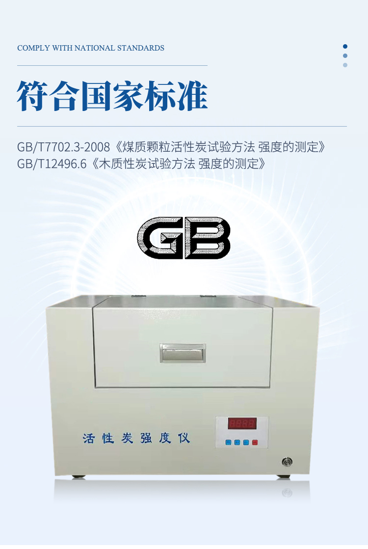 活性炭強度測定儀是按照GB/T7702.3-2008《煤質顆粒活性炭試驗方法 強度的測定》和GBT12496.6《木質性炭試驗方法 強度的測定》開發設計,適用于煤質顆粒活性炭強度的測定和木質活性炭強度的測定。
