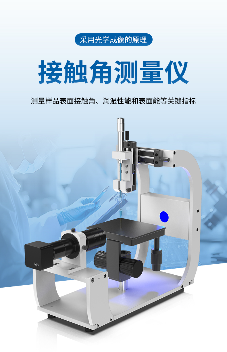光學接觸角測量儀是測量液體對固體材料接觸角的儀器,主要用于表征液體對固體材料表面的潤濕性能,通過光學成像獲取液滴的圖像,利用計算機軟件,通過數學模型擬合出液滴圖像的輪廓并得到接觸角或表面張力,并進行表面能計算和潤濕性分析。