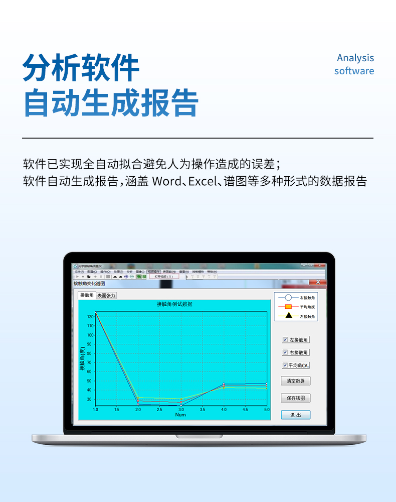 6.分析軟件功能強大:具備一鍵式全自動擬合能力,具備國際最領先的擬合方法,滿足各種液滴形態的精確擬合;