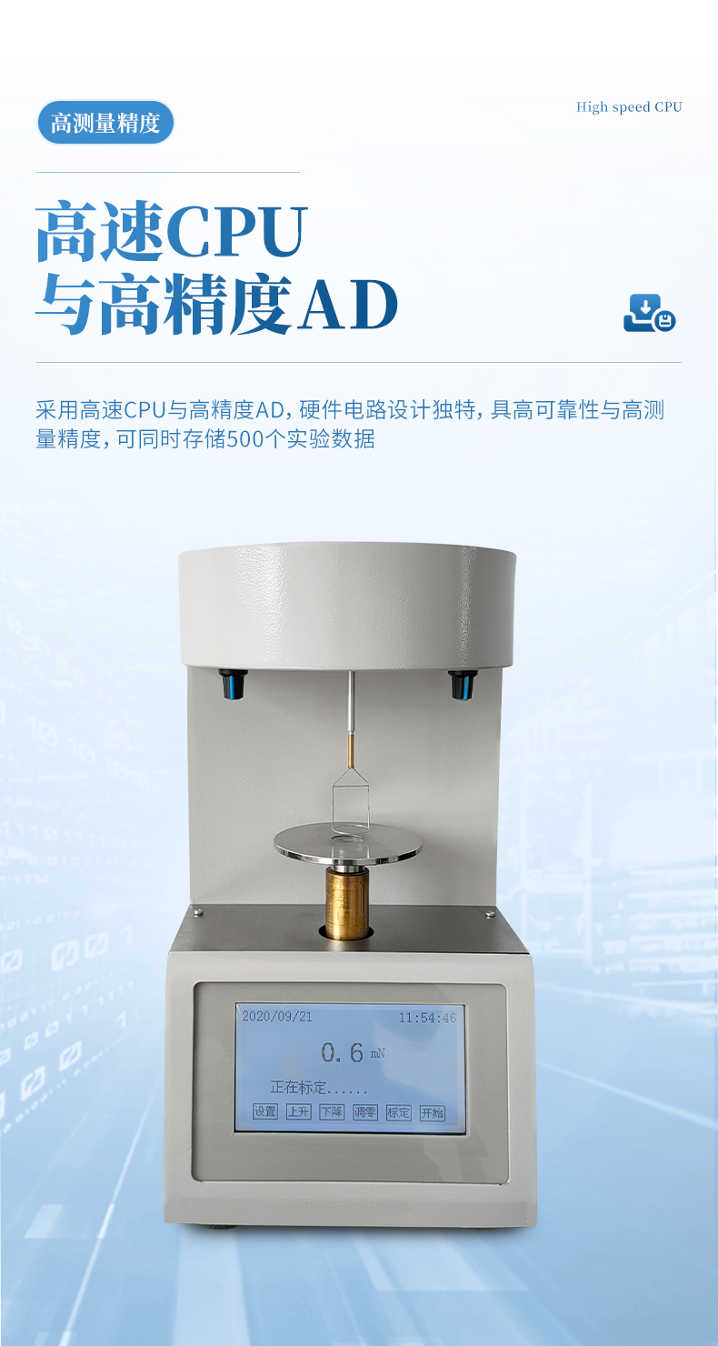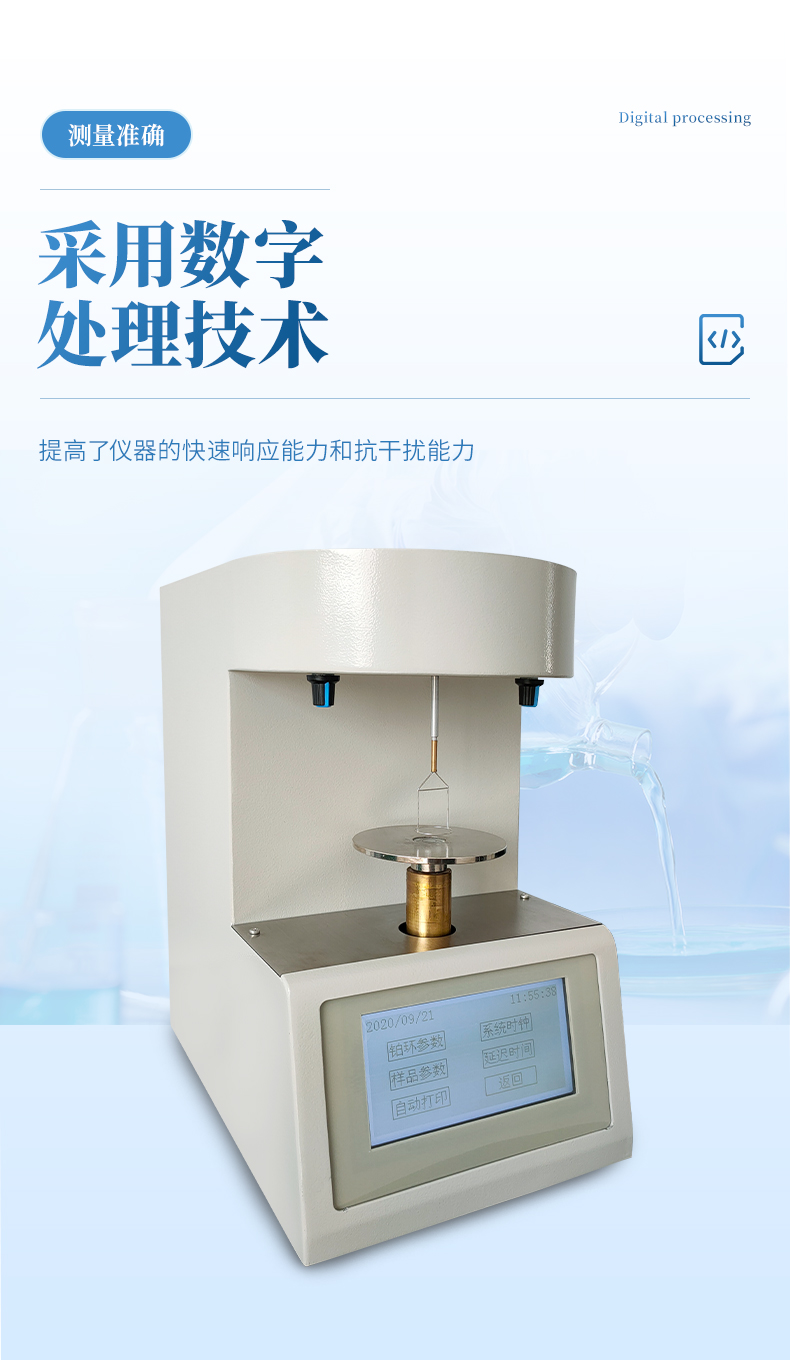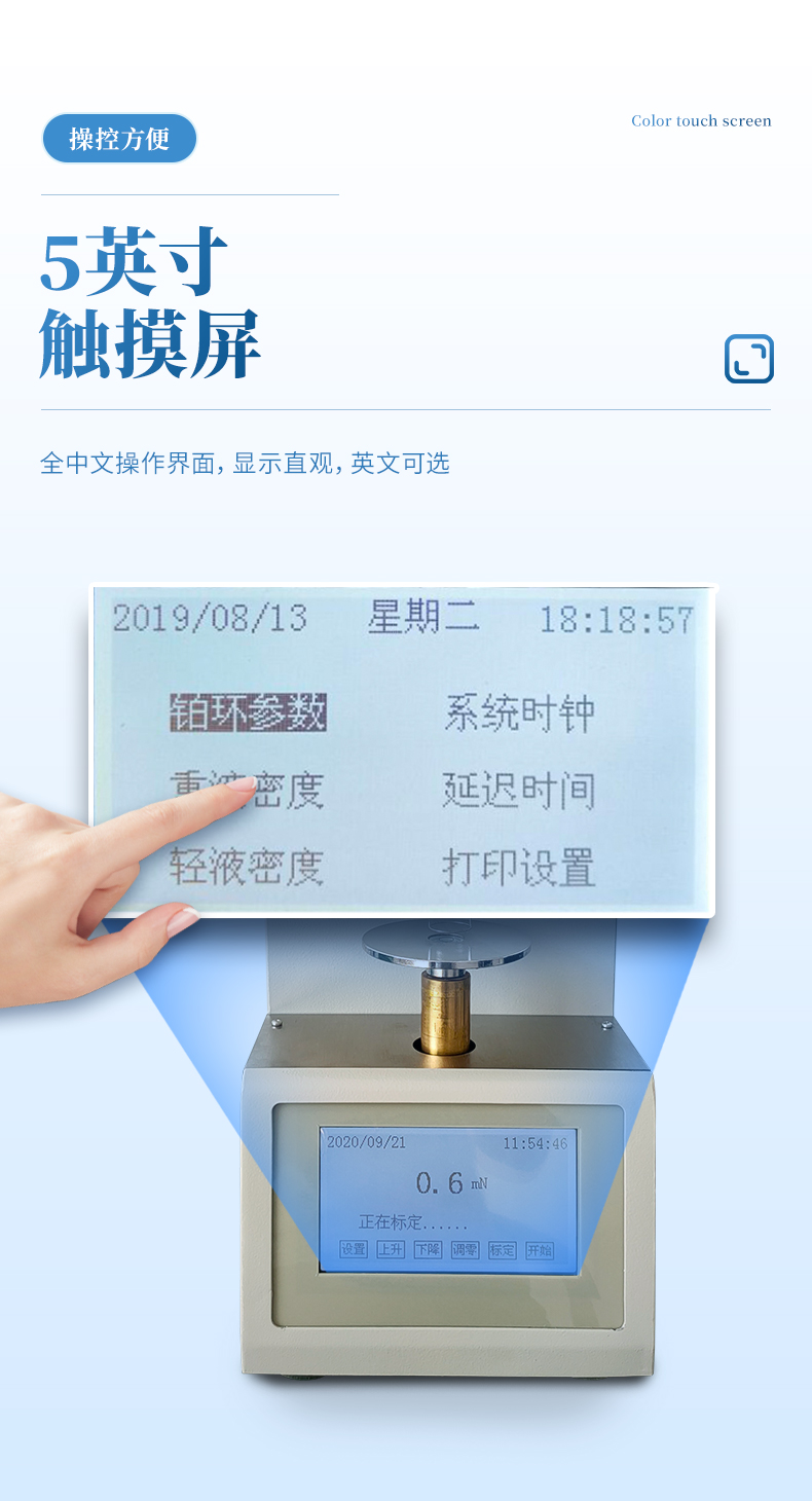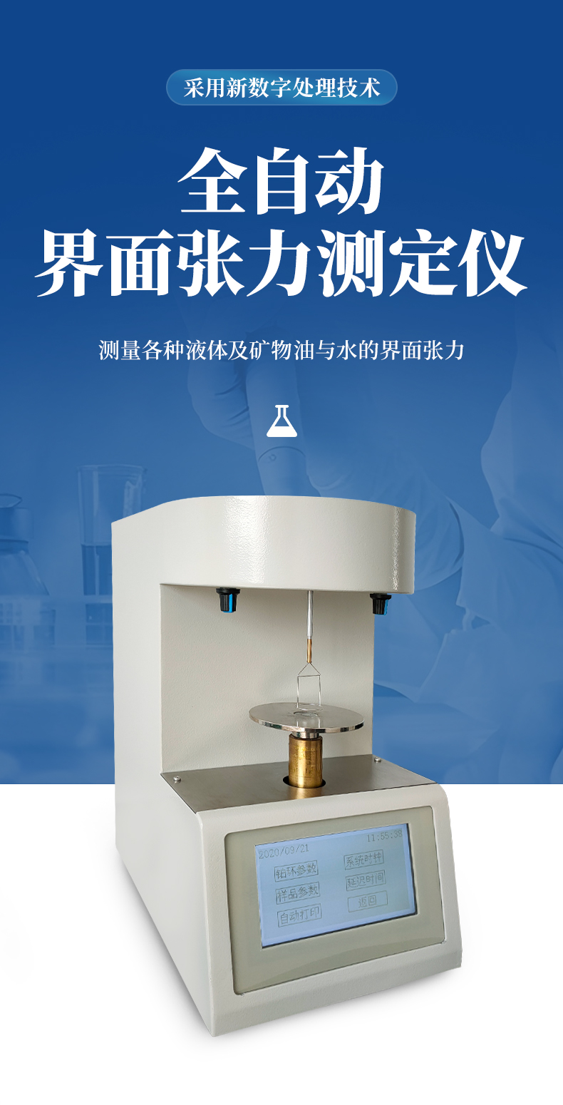 符合GB/T 5549-2010的方法要求,采用鉑金板法在非平衡的條件下,測量各種液體表面張力及礦物油與水的界面張力,能可靠的指示出親水氧化物的存在情況。采用最新數字處理技術,提高了儀器的快速響應能力和抗干擾能力,全中文交互式菜單,觸摸屏操作,人機界面簡潔友好。 并可選配臺式熱敏微型打印機,可自動打印測試結果。