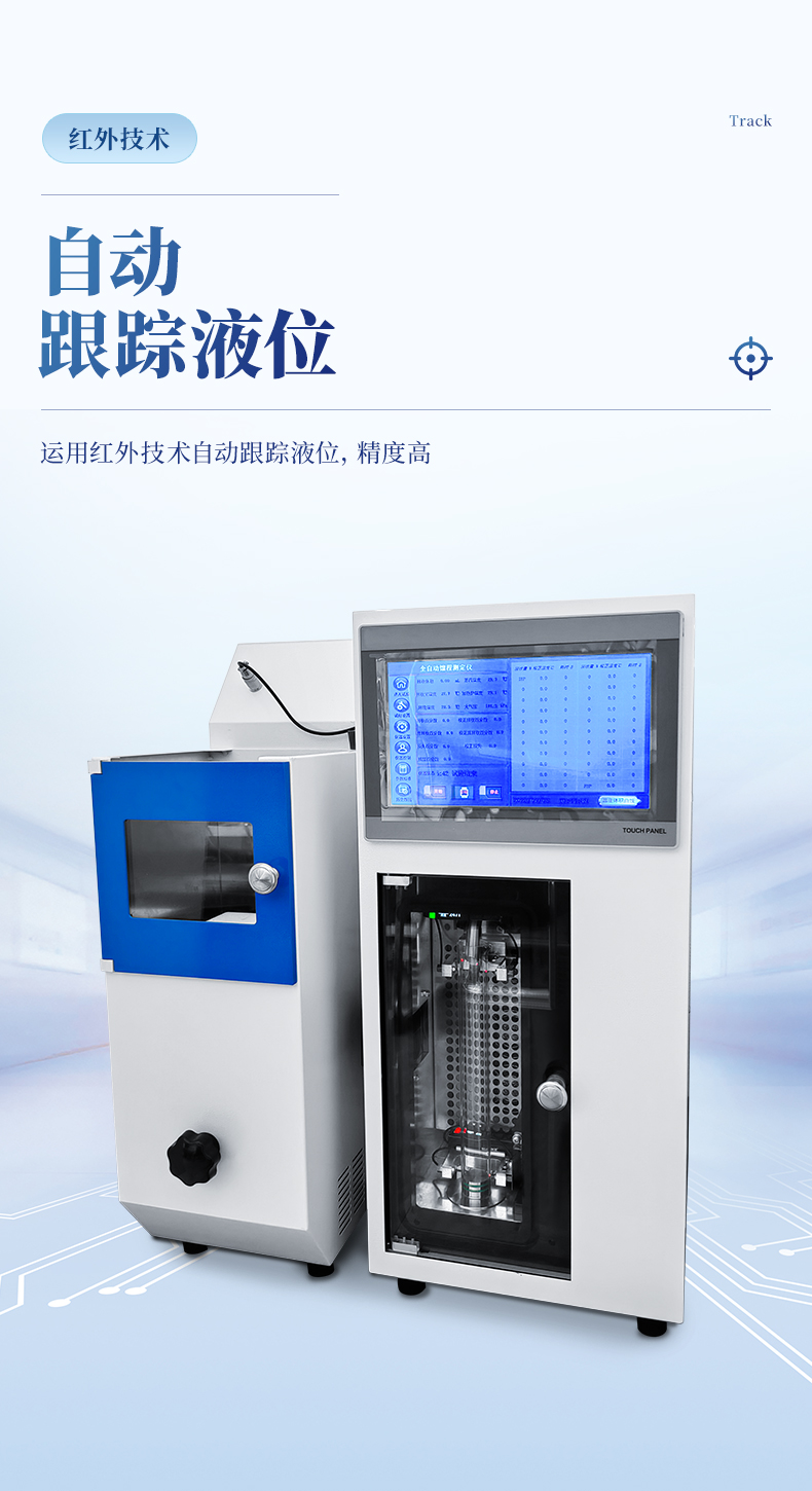 8.儀器實現(xiàn)自動控制電爐功率,自動跟蹤液位,回收室和冷凝管自動控制溫度,自動計算。