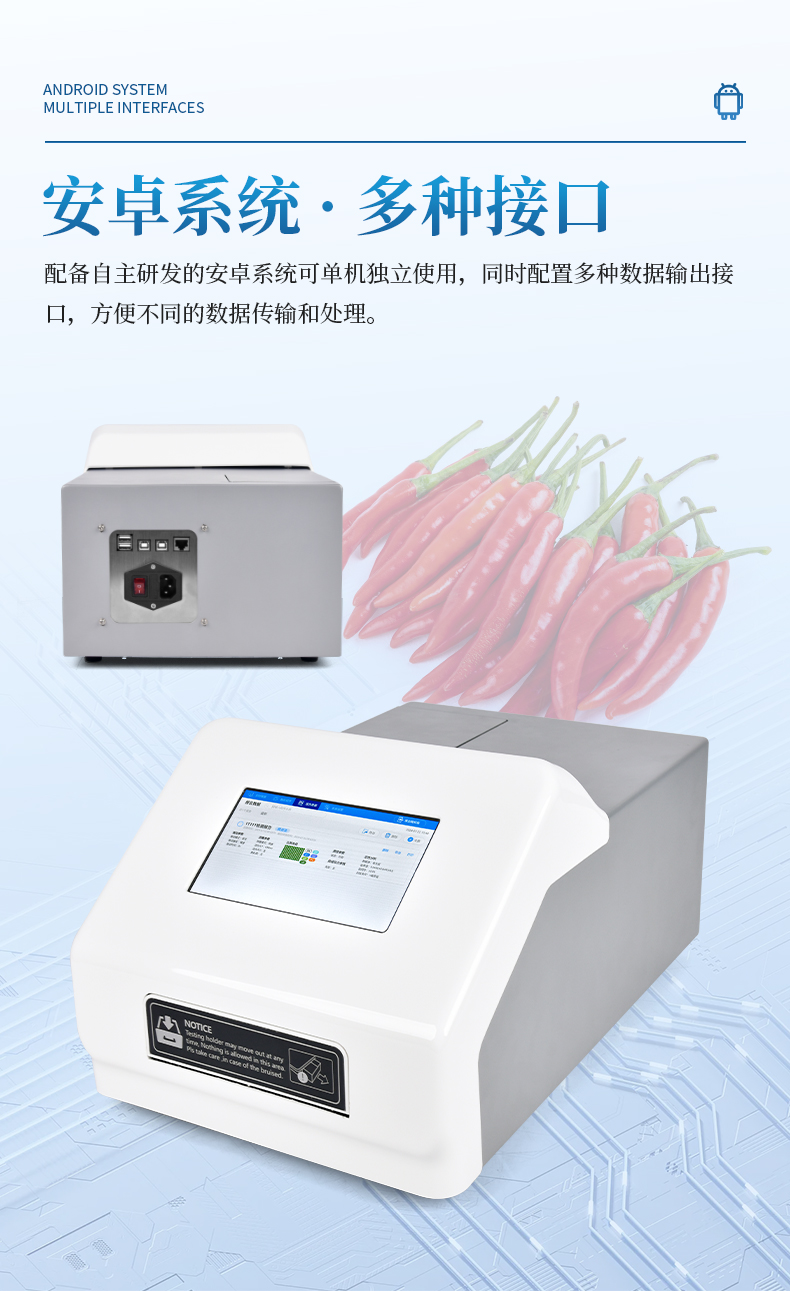 辣椒素檢測(cè)儀主要用于各種辣椒及辣椒制品中的天然辣椒素、辣度檢測(cè)。儀器由亮度發(fā)光二管光源、比色池、高靈敏度集成光電池、微處理器、漢字大屏幕液晶屏、嵌入式微型熱敏打印機(jī)集成芯片構(gòu)成,可直接在大屏幕液晶屏上顯示出被測(cè)樣品中相關(guān)指標(biāo)的含量,并打印出分析結(jié)果,還可以通過(guò)計(jì)算機(jī)接口將數(shù)據(jù)傳輸?shù)诫娔X進(jìn)行數(shù)據(jù)分析。