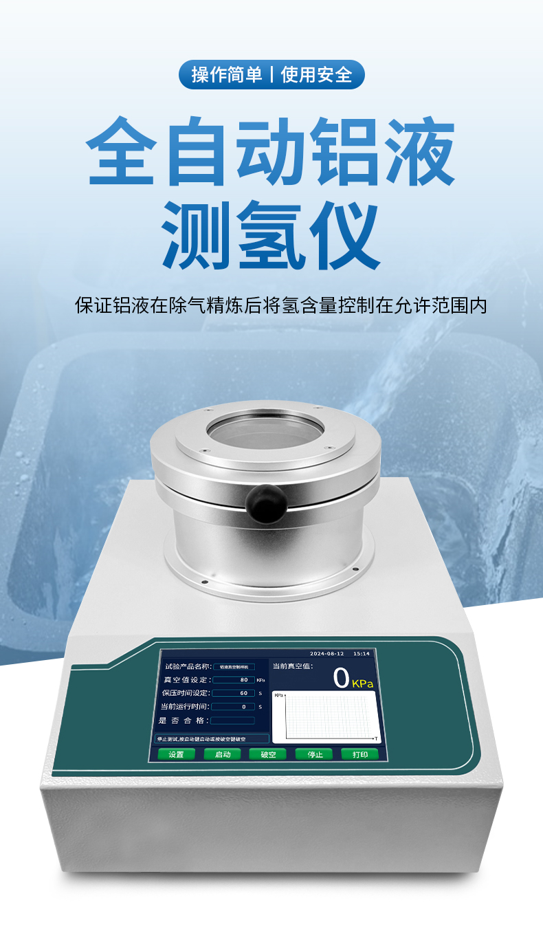由于鋁液是在真空中凝固,其整個(gè)凝固過程不受外界空氣的影響,測(cè)得試樣的含氫量就是坩堝取樣時(shí)的含氫量。設(shè)備具有檢測(cè)準(zhǔn)確、運(yùn)行可靠、易于操作、維護(hù)簡(jiǎn)便等優(yōu)點(diǎn),是鋁制件廠檢測(cè)含氫量的理想設(shè)備。