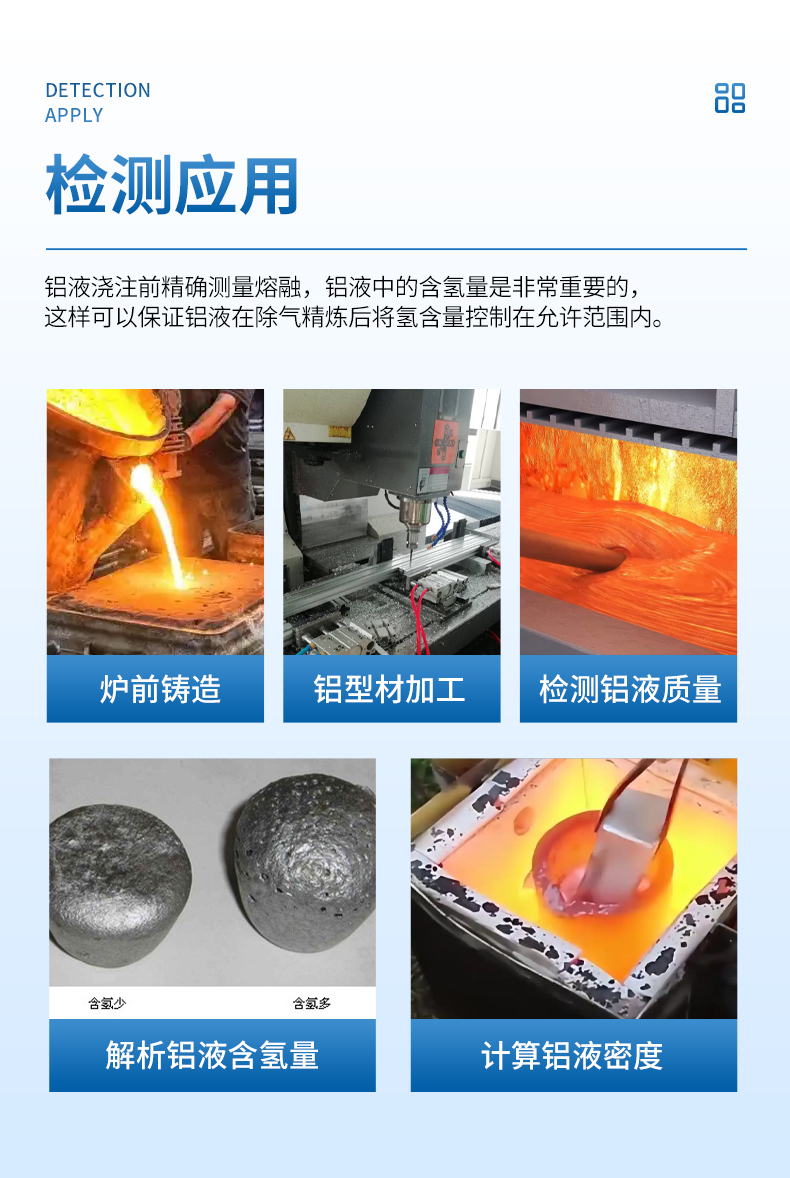 鋁液中唯一大量存在的氣體氫和各種夾渣的存在,使得鋁鑄件極易產(chǎn)生針孔、 顯微疏松等缺陷,導(dǎo)致力學(xué)性能、內(nèi)部質(zhì)量大為降低。因此在澆注前精確測(cè)量熔融鋁液中的含氫量是非常重要的,這樣可以保證鋁液在除氣精煉后將氫含量控制在允許范圍內(nèi)。