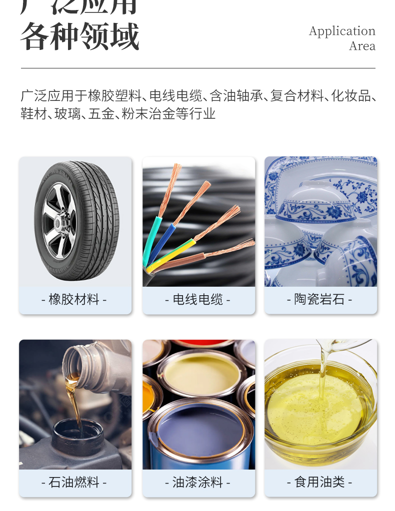 運用范圍:橡膠、塑膠、電線電纜、電工電器、體育器材、輪胎、玻璃制品、硬質合金、粉末冶金、磁性材料、密封件、陶瓷、海綿、EVA材料、發泡體材料、合金材料、摩擦材料、新材料研、電池材料、研究實驗室。