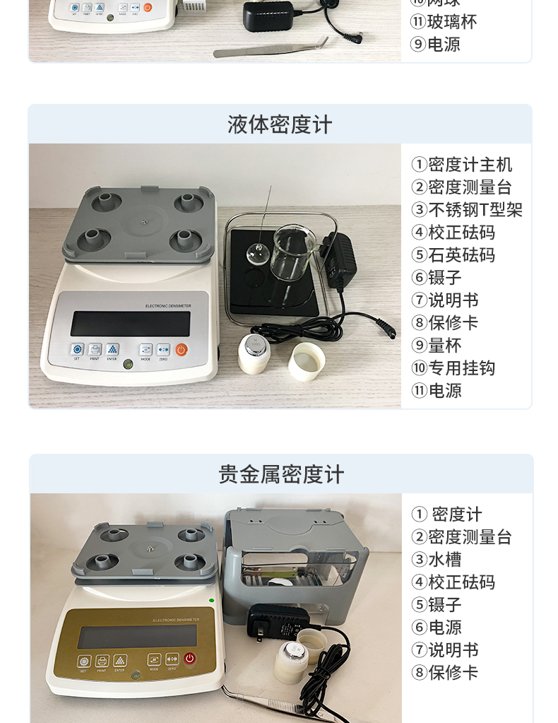 密度計主機②密度測量臺③水槽④校正砝碼⑤抗浮架⑥鑷子⑦說明書⑧保修卡⑨網球⑩玻璃杯?電源