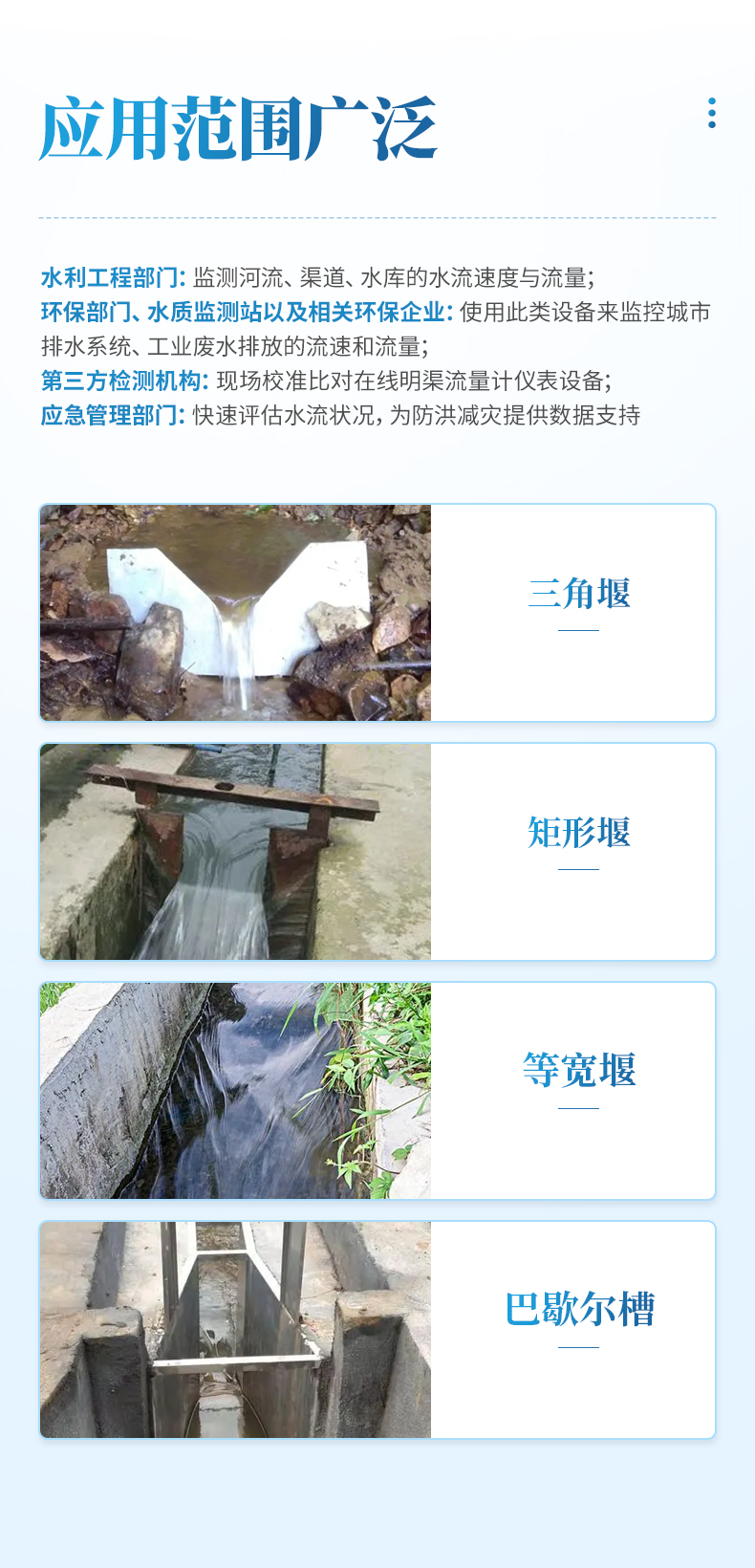 水利工程部門:監(jiān)測(cè)河流、渠道、水庫的水流速度與流量;