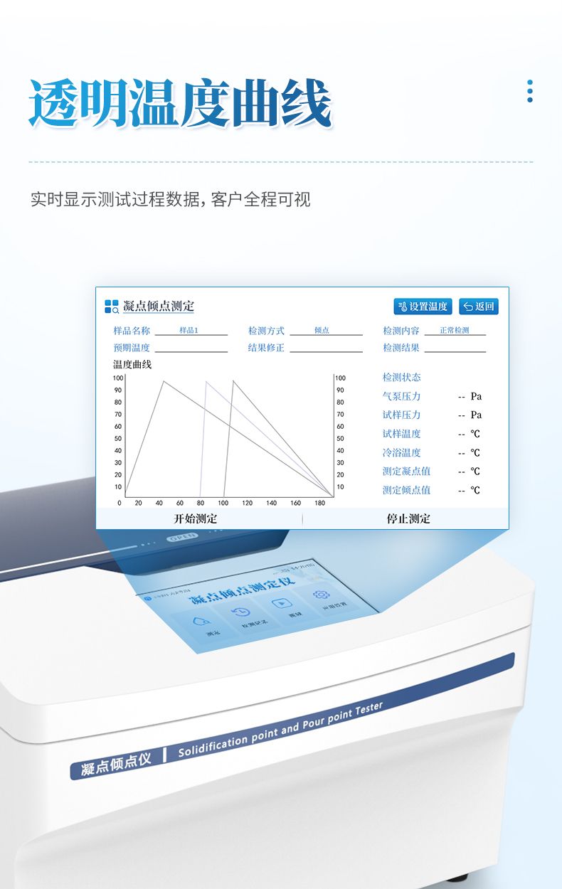 利用自動(dòng)氣壓法,對(duì)樣品進(jìn)行預(yù)熱(45℃或預(yù)期值+9℃)后,按照規(guī)定的降溫速率進(jìn)行降溫。樣品溫度從預(yù)期值+15℃開始,每隔1℃自動(dòng)加壓測(cè)試。實(shí)驗(yàn)結(jié)果與GB/T 510、ISO3016和ASTM D97所描述的傾斜法完全一致。