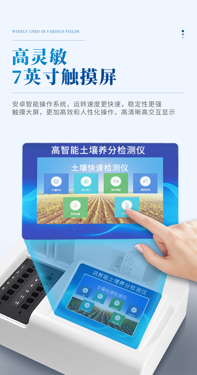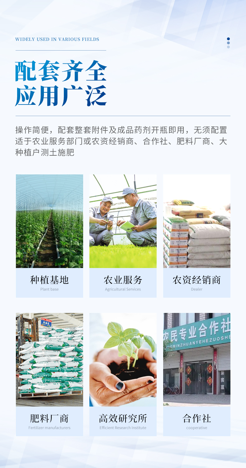 配套齊全:該儀器無(wú)需用戶自配附件,相當(dāng)于一個(gè)小型實(shí)驗(yàn)室。適于農(nóng)業(yè)服務(wù)部門(mén)或農(nóng)資經(jīng)銷商、合作社、肥料廠商、大種植戶測(cè)土施肥和鑒別肥料真假。