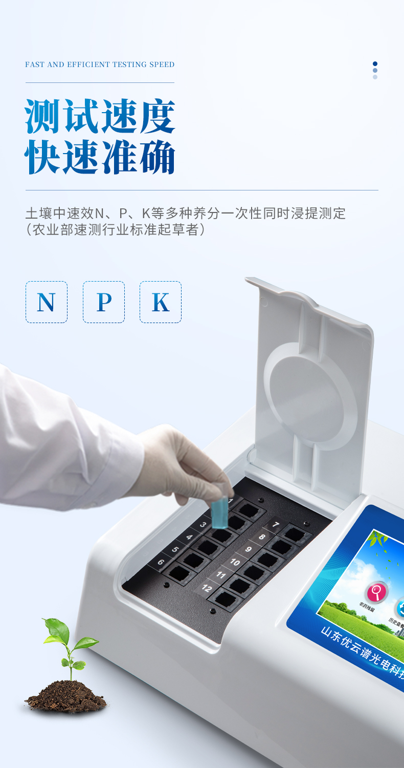 測(cè)試一個(gè)肥料樣(N、P、K)≤50分鐘,同時(shí)檢測(cè)三個(gè)肥料樣品(N、P、K)≤1.5小時(shí)。