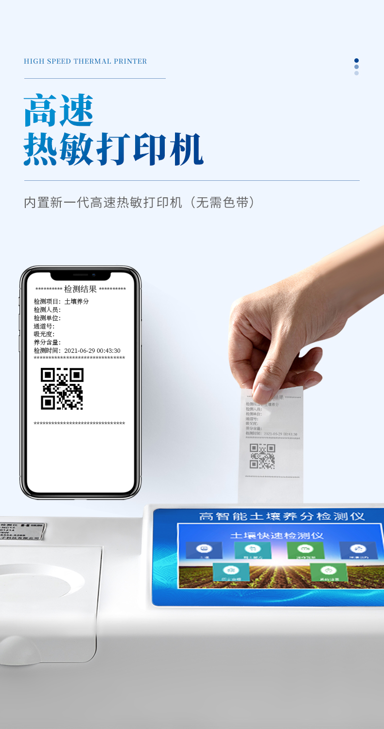 14、內(nèi)置新一代高速熱敏打印機(jī)(無(wú)需色帶),打印內(nèi)容包含:檢測(cè)單位、檢測(cè)人員、檢測(cè)項(xiàng)目、通道號(hào)、吸光度、養(yǎng)分含量(mg/kg)、檢測(cè)時(shí)間、以及二維碼等信息