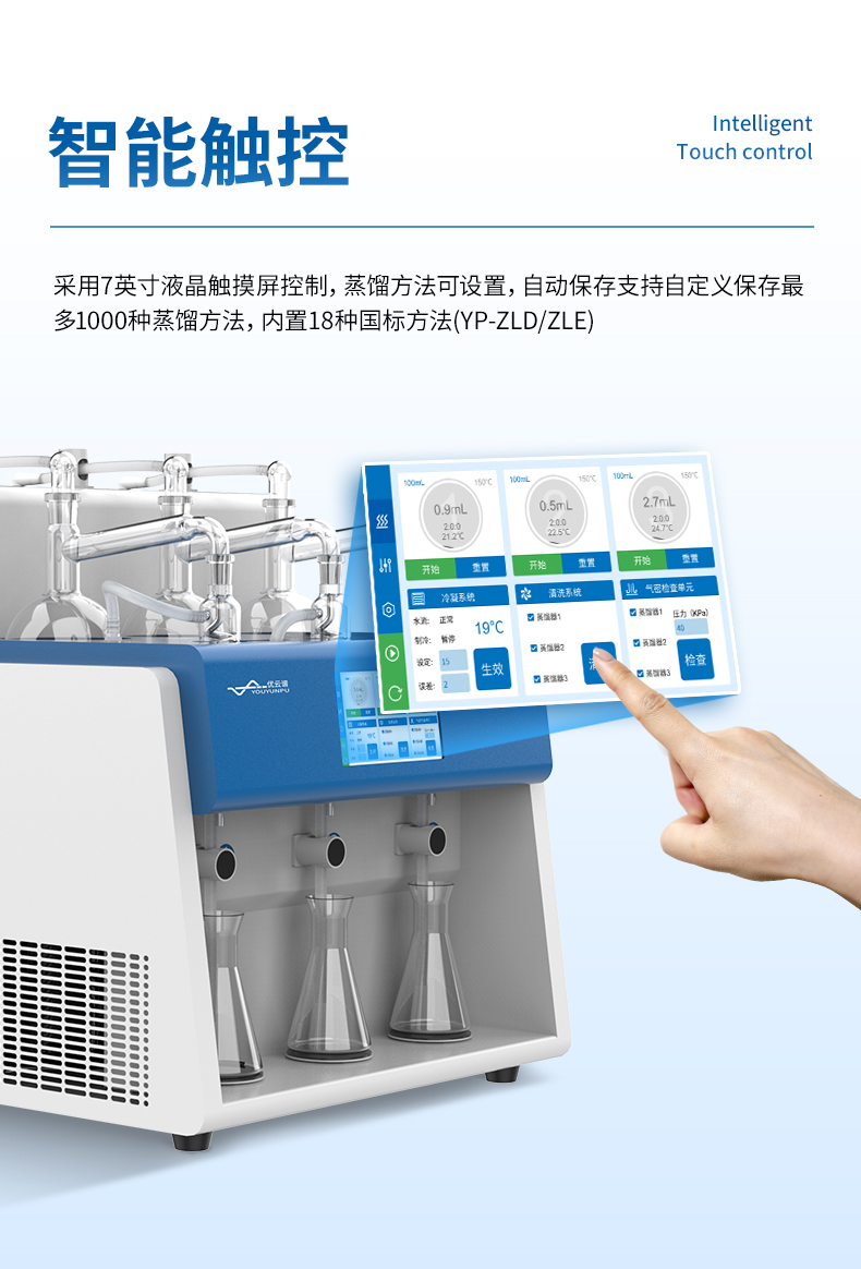 3.智能觸控:7寸液晶觸摸屏,支持自定義保存最多1000種蒸餾方法,內置18種國標方法。
