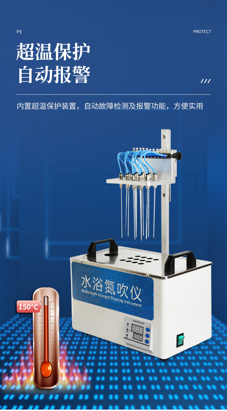 7.圓形氮吹儀的所有部件均勻不銹鋼制造,可耐酸堿等有機溶劑。