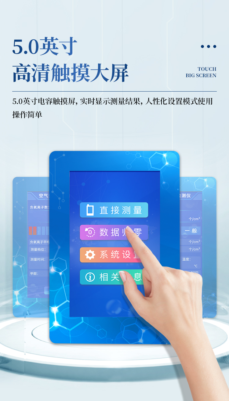 多功能負離子檢測儀操作簡單,5.0英寸全彩大屏顯示實時測量數據、儀器工作狀態、自動計算平均值。操作人員零基礎無需專業培訓也可快速測量。