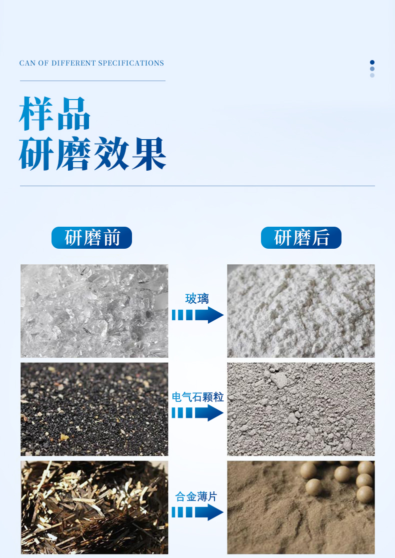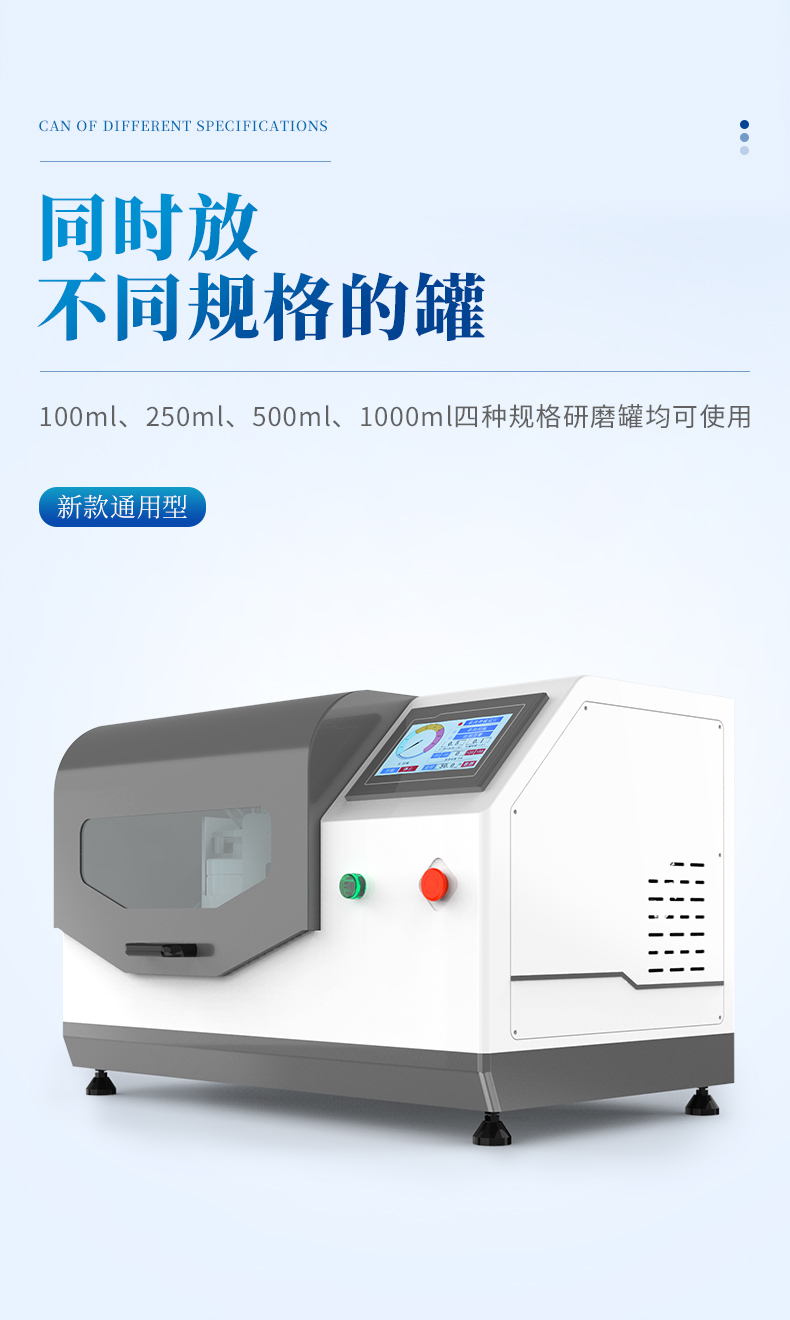 適用研磨罐:本機(jī)是新款通用型,100ml、250ml、500ml、1000ml四種規(guī)格研磨罐均可使用,可根據(jù)客戶需求同時放不同規(guī)格的罐;對角對稱即可(4個研磨罐為一套)。