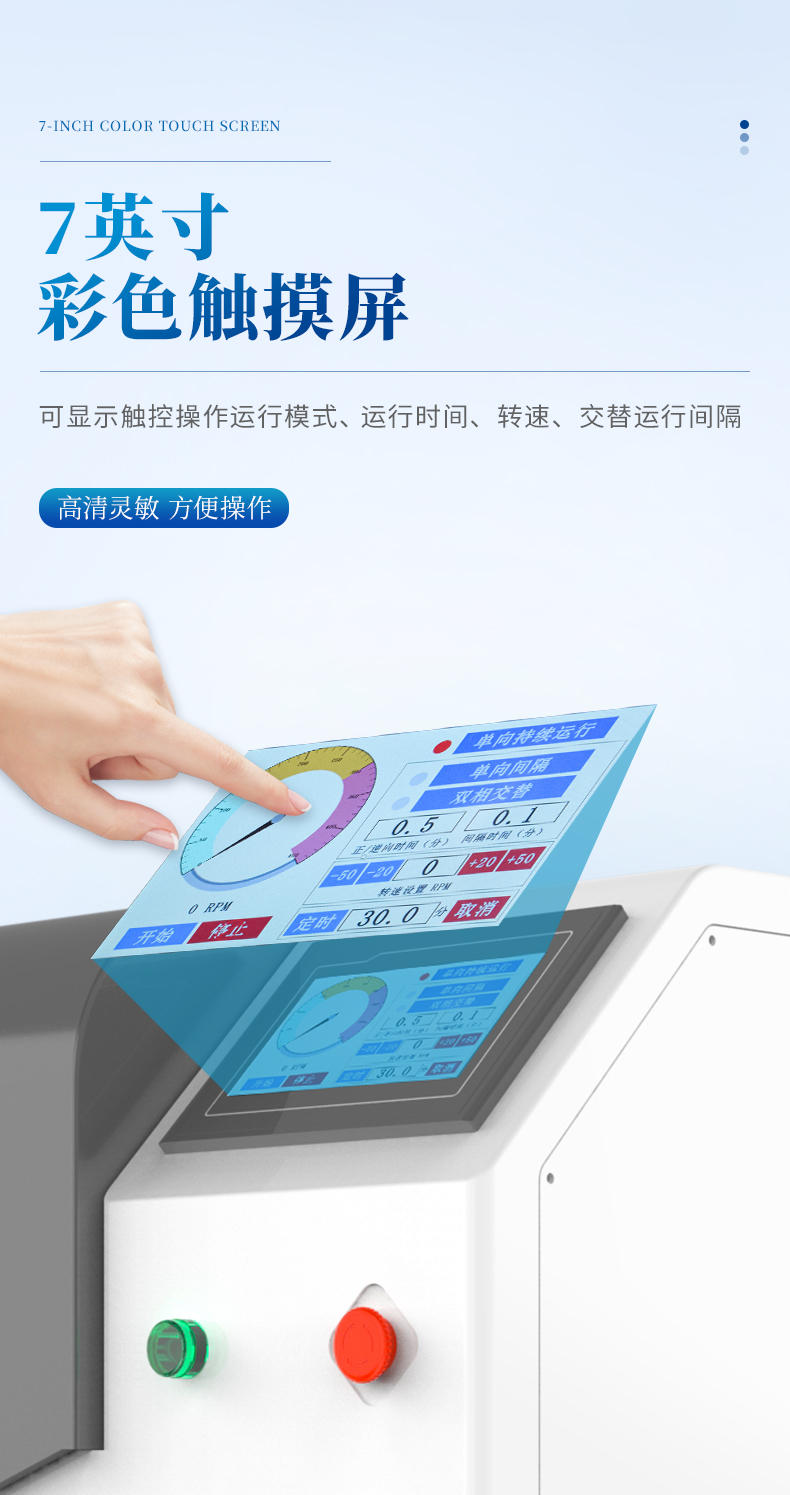 顯示方式:7.0寸彩色液晶顯示屏,可顯示、觸控操作運(yùn)行模式、運(yùn)行時間、轉(zhuǎn)速、交替運(yùn)行間隔
