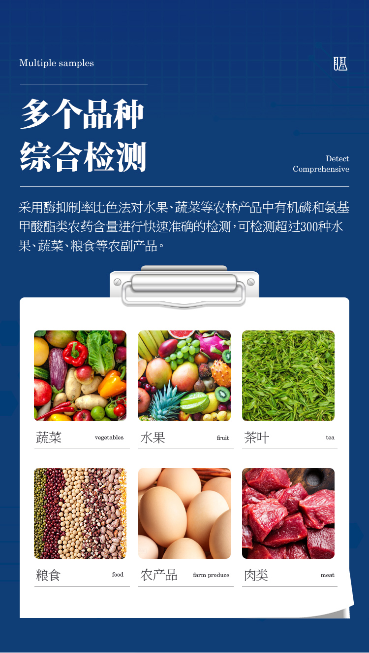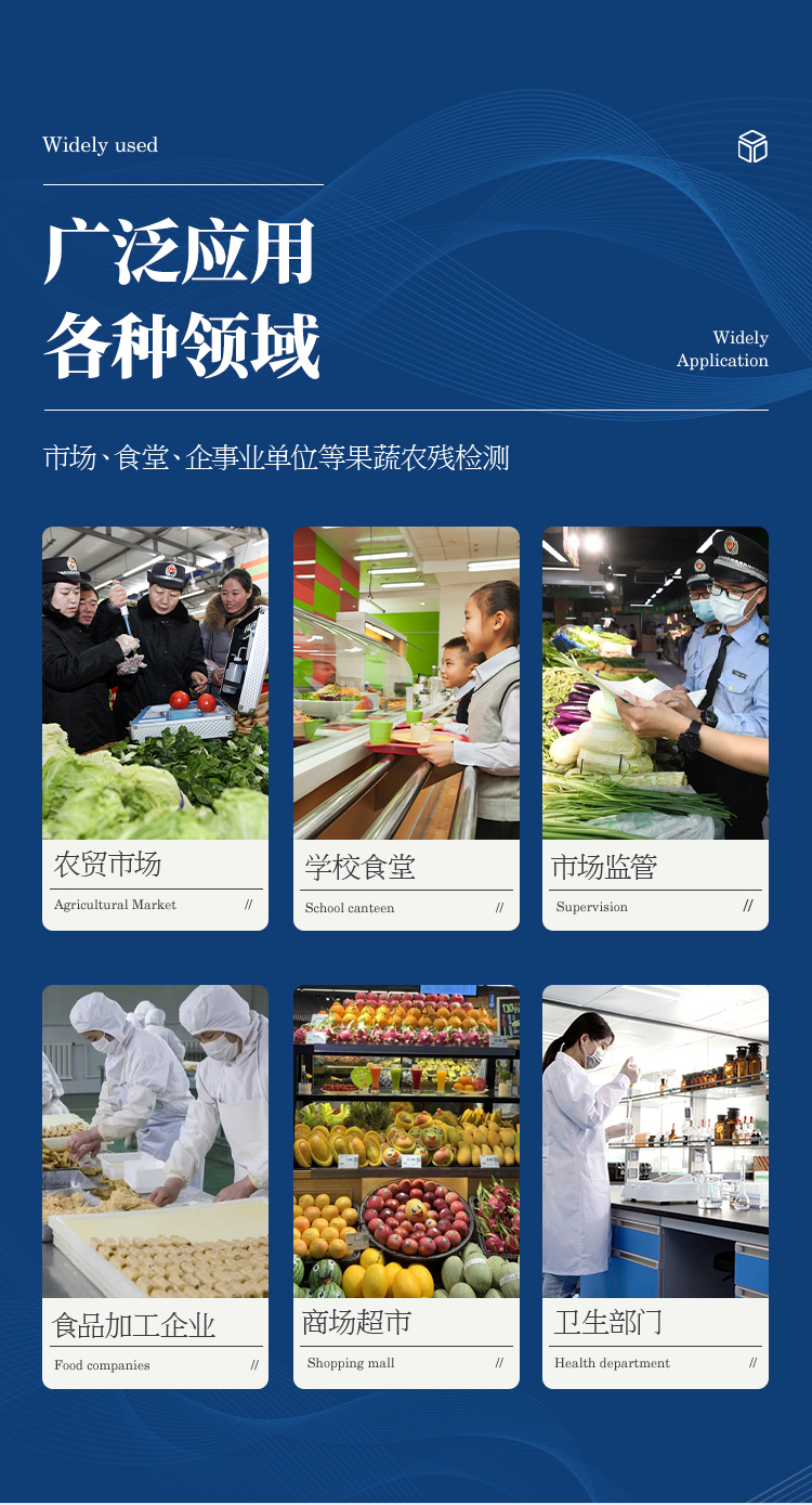 廣泛應用于主要用于蔬菜、水果、茶葉、糧食、農副產品等食品中有機磷和氨基甲酸酯類農藥殘留的快速檢測;此外還可用于果蔬茶生產基地和農貿批發銷售市場現場檢測,餐館、學校、食堂、家庭果蔬加工前的安全速測等。