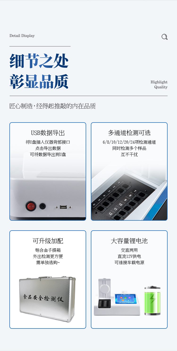 可快速檢測各類食品中的甲醛、吊白塊、二氧化硫、亞硝酸鹽、雙氧水、硼砂、農藥殘留、乳及乳制品中蛋白質的含量,儀器預留其他項目檢測程序和端口,根據日后需求可方便的自主增加檢測項目。