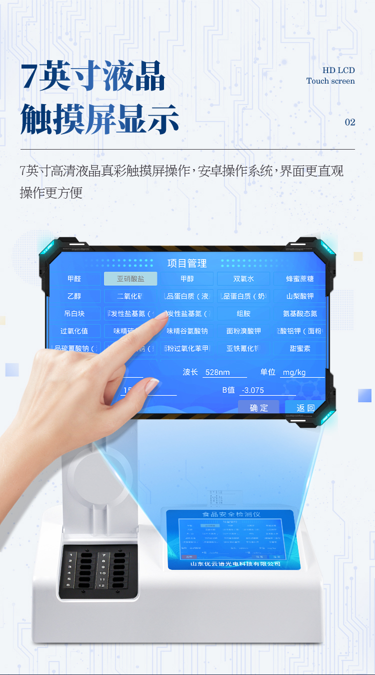 1、檢測(cè)項(xiàng)目:可快速檢測(cè)各類(lèi)食品中的甲醛、二氧化硫、亞硝酸鹽、吊白塊、農(nóng)藥殘留的含量,儀器預(yù)留其他項(xiàng)目檢測(cè)程序和端口,根據(jù)日后需求可方便的自主增加檢測(cè)項(xiàng)目。