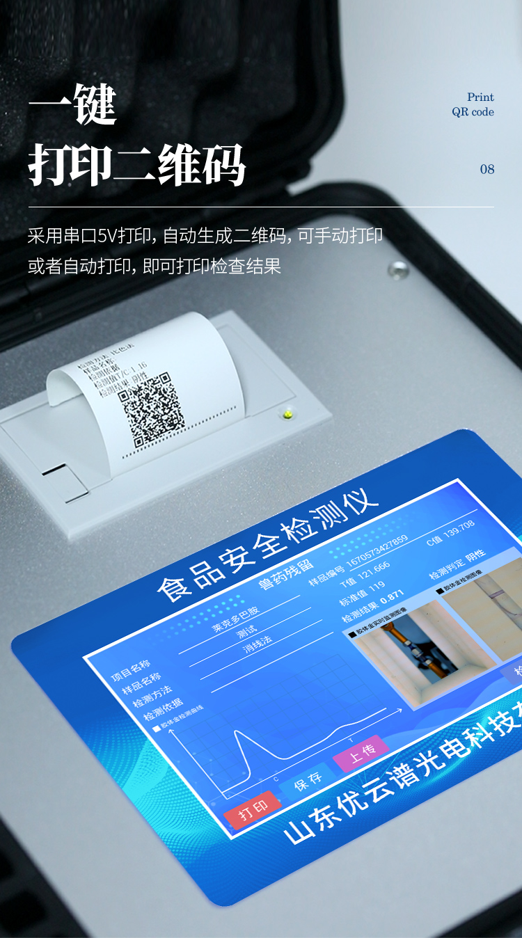 3、新一代高速熱敏打印機(jī),檢測完成可自動(dòng)打印或批量打印檢測報(bào)告和二維碼。
