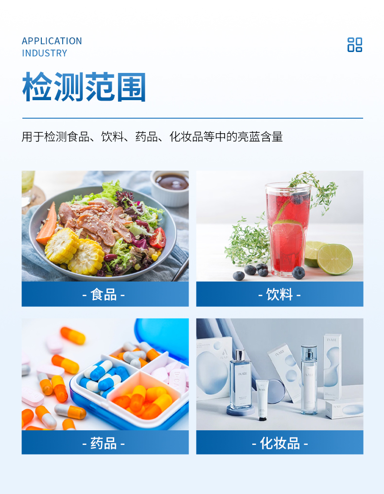 亮藍檢測儀,主要用于檢測食品、飲料、藥品、化妝品等中的亮藍含量,?具有操作簡單的特點。亮藍,又稱為誘惑藍,是一種常用的合成食品著色劑,廣泛應用于食品、飲料和藥品中。通過亮藍檢測儀的檢測結(jié)果,可以看出這些產(chǎn)品中的亮藍含量是否符合國家和國際標準,從而保障其安全性和合規(guī)性? 。