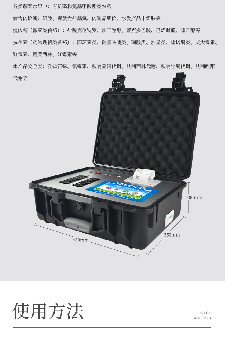 該多功能食品安全檢測儀為集成化食品安全快速檢測分析設備,廣泛應用于市場監管局、食品肉產品深加工企業、學校食堂、衛生部門、畜牧部門、屠宰場、檢驗檢疫部門等單位使用。