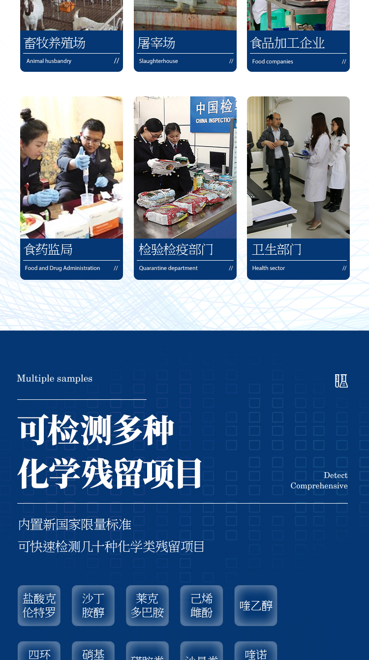 抗生素殘留檢測儀可現場快速檢測多類別抗生素類殘留,如可快速檢測四環素類、硝基呋喃類、磺胺類、沙星類、喹諾酮類、氯霉素、慶大霉素、鏈霉素、喹乙醇代謝物、硫酸鏈霉素、羧芐青霉素、噻孢菌素鈉、阿莫西林、氨芐西林、紅霉素、潮霉素B、安普霉紊、桿菌肽、氨丙琳、芐青霉家、頭孢噻呋、克拉維酸、氯羥吡啶、阿散酸等抗生素快速檢測;水產獸藥:呋喃妥因代謝、呋喃西林代謝、呋喃它酮代謝、呋喃唑酮代謝、孔雀石綠等。