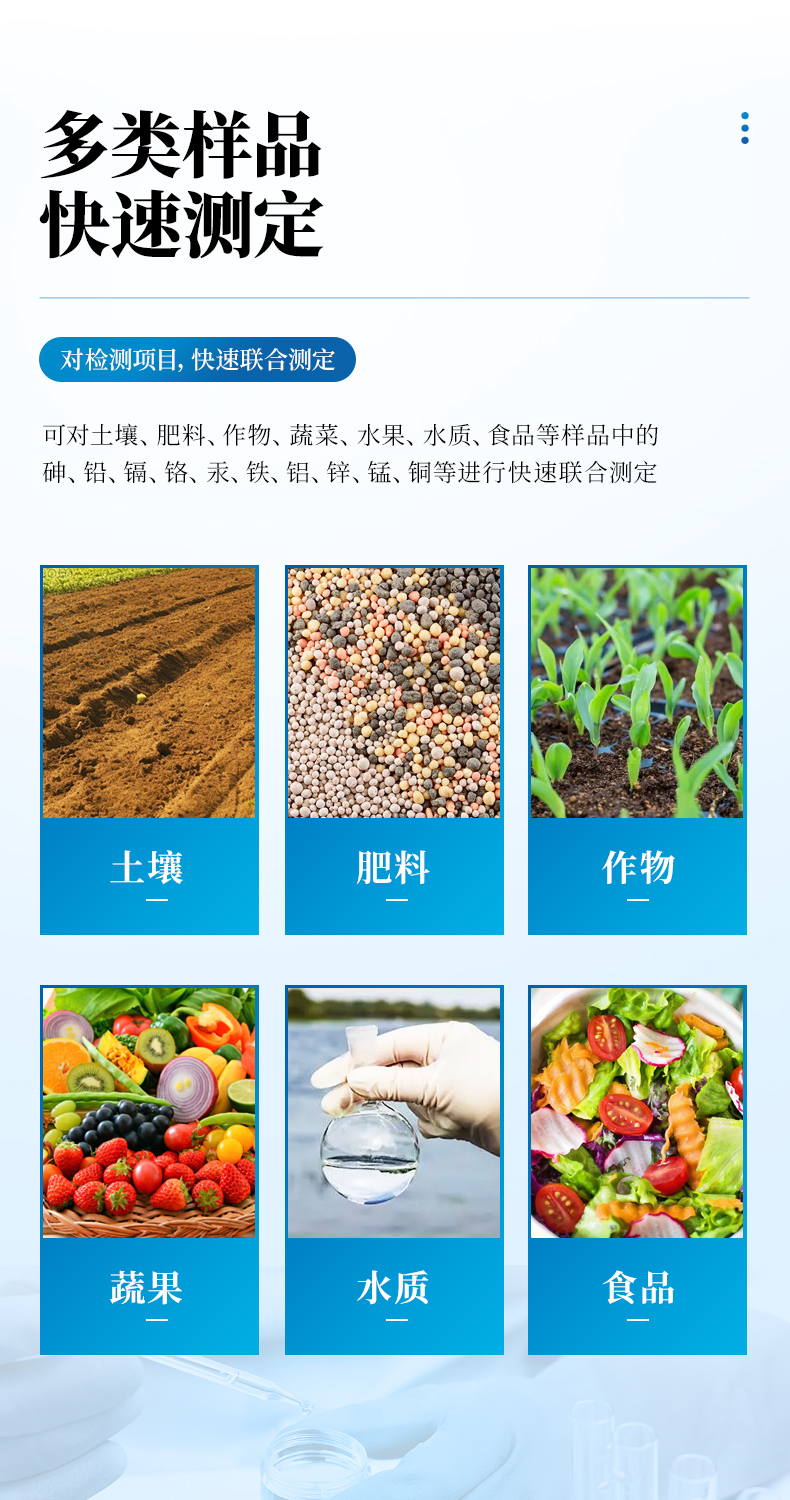 可對土壤、肥料、作物、蔬菜、水果、水質、食品等樣品中的砷、鉛、鎘、鉻、汞、鐵、鋁、鋅、錳、銅等進行快速聯合測定。