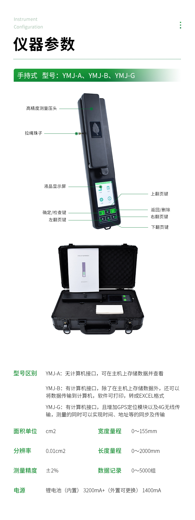 YMJ系列葉面積測量儀是一種使用方便、可以在野外工作的便攜式儀器。可以精確、快速、無損傷地測量葉片的葉面積及相關參數,也可對采摘的植物葉片及其它片狀物體進行面積測量。廣泛應用于農業、氣象、林業等部門。
