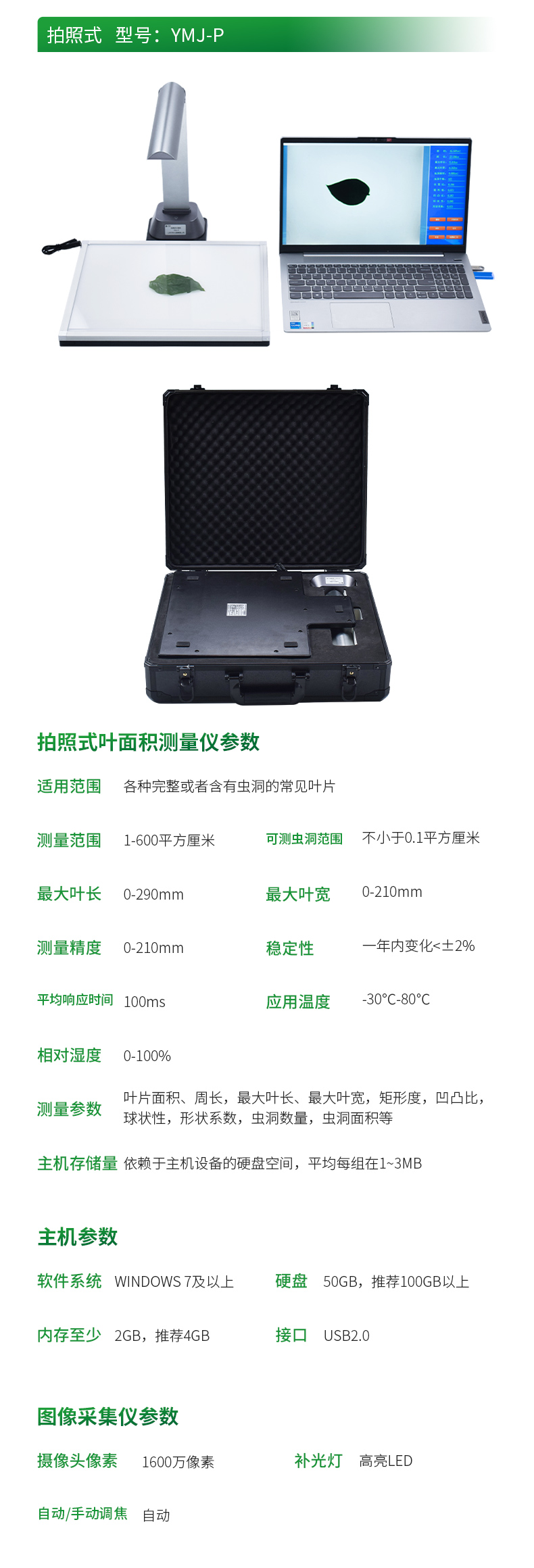 YMJ系列活體葉面積測量儀是研發的產品。是一種使用方便,可以在野外工作的便攜式儀器。它可以精確、快速、無損傷地測量葉片的葉面積及相關參數,也可對采摘的植物葉片及其他片狀物體進行面積測量。廣泛應用于農業、氣象、林業等部分。