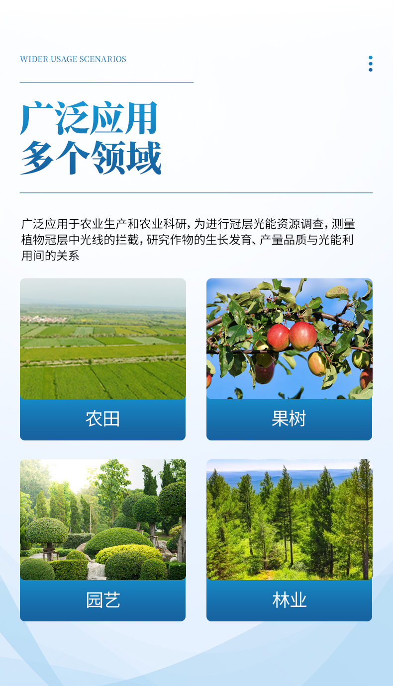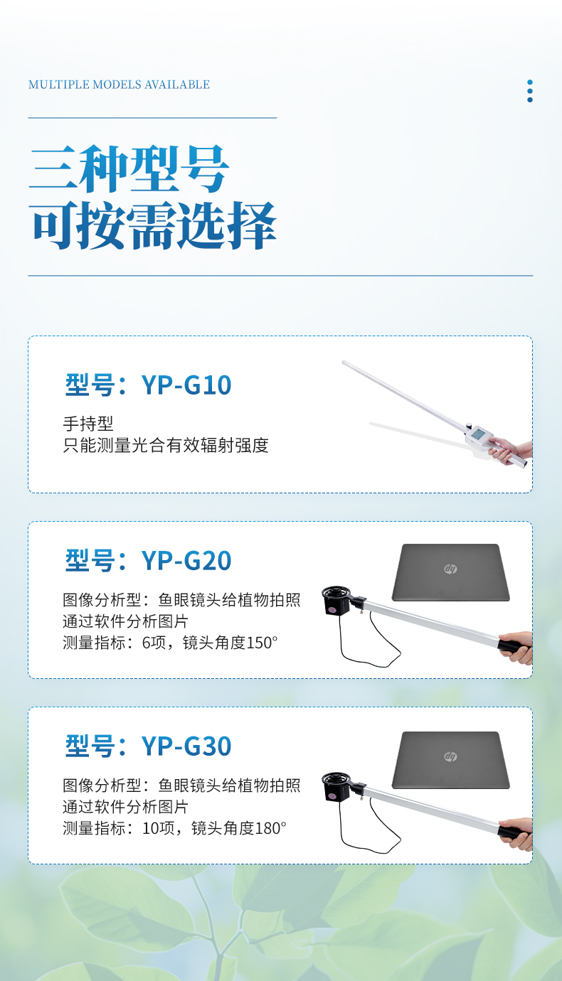 YP-G10植物冠層測量儀可廣泛應用于農業生產和農業科研,為進行冠層光能資源調查,測量植物冠層中光線的攔截,研究作物的生長發育、產量品質與光能利用間的關系,本儀器用于400nm-700nm波段內的光合有效輻射(PAR)測量、記錄,測量值的單位是平方米·秒上的微摩爾(μmol㎡/秒)。
