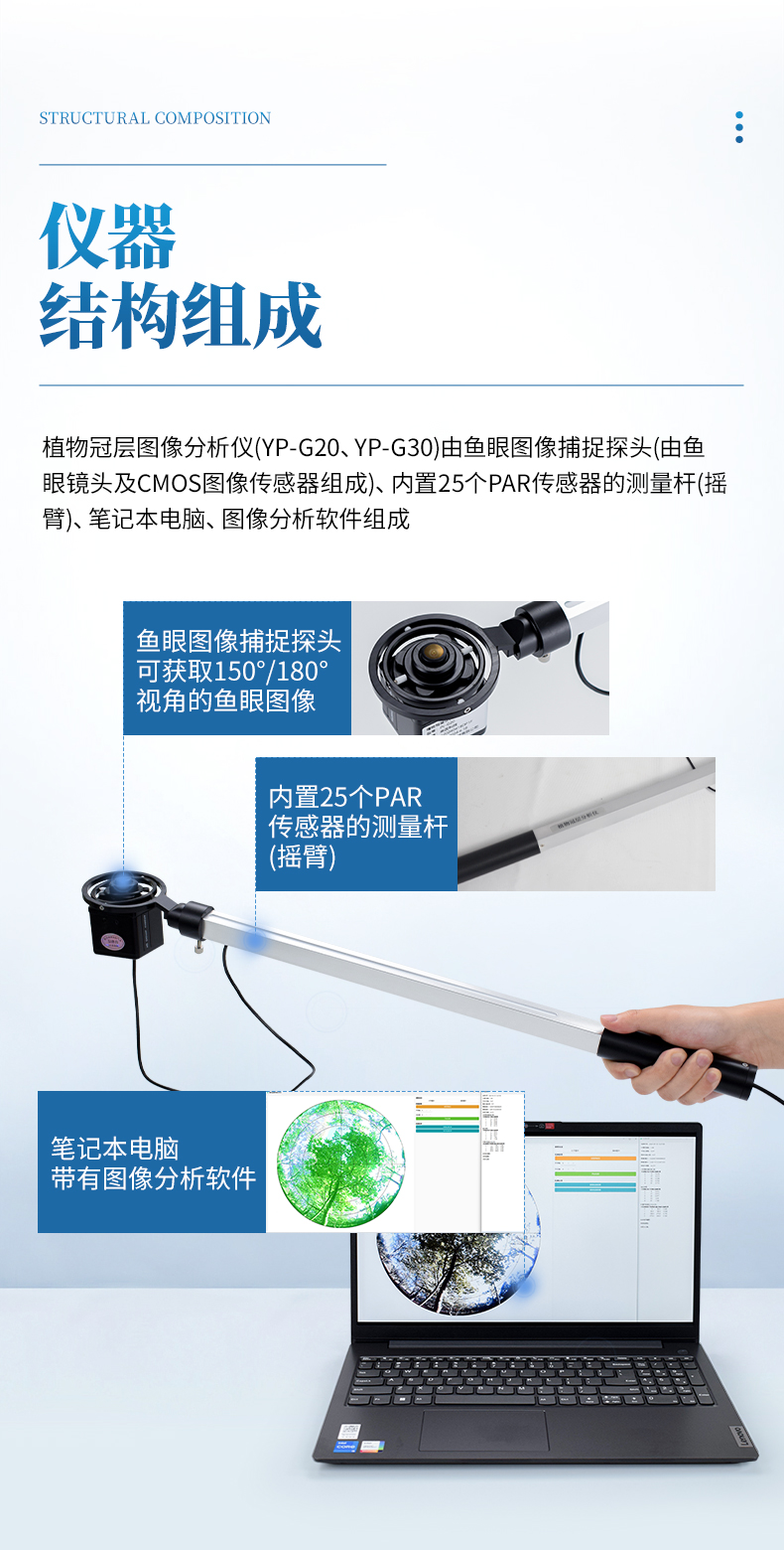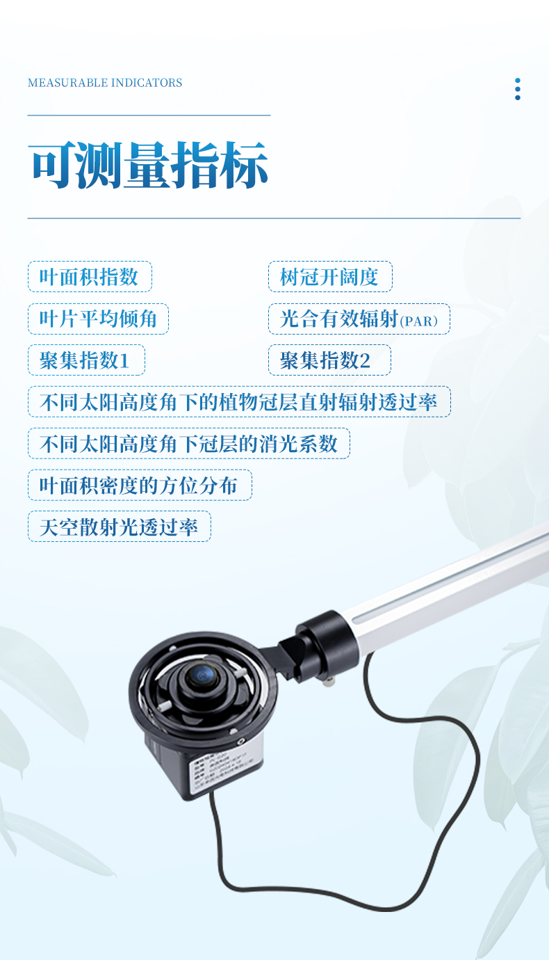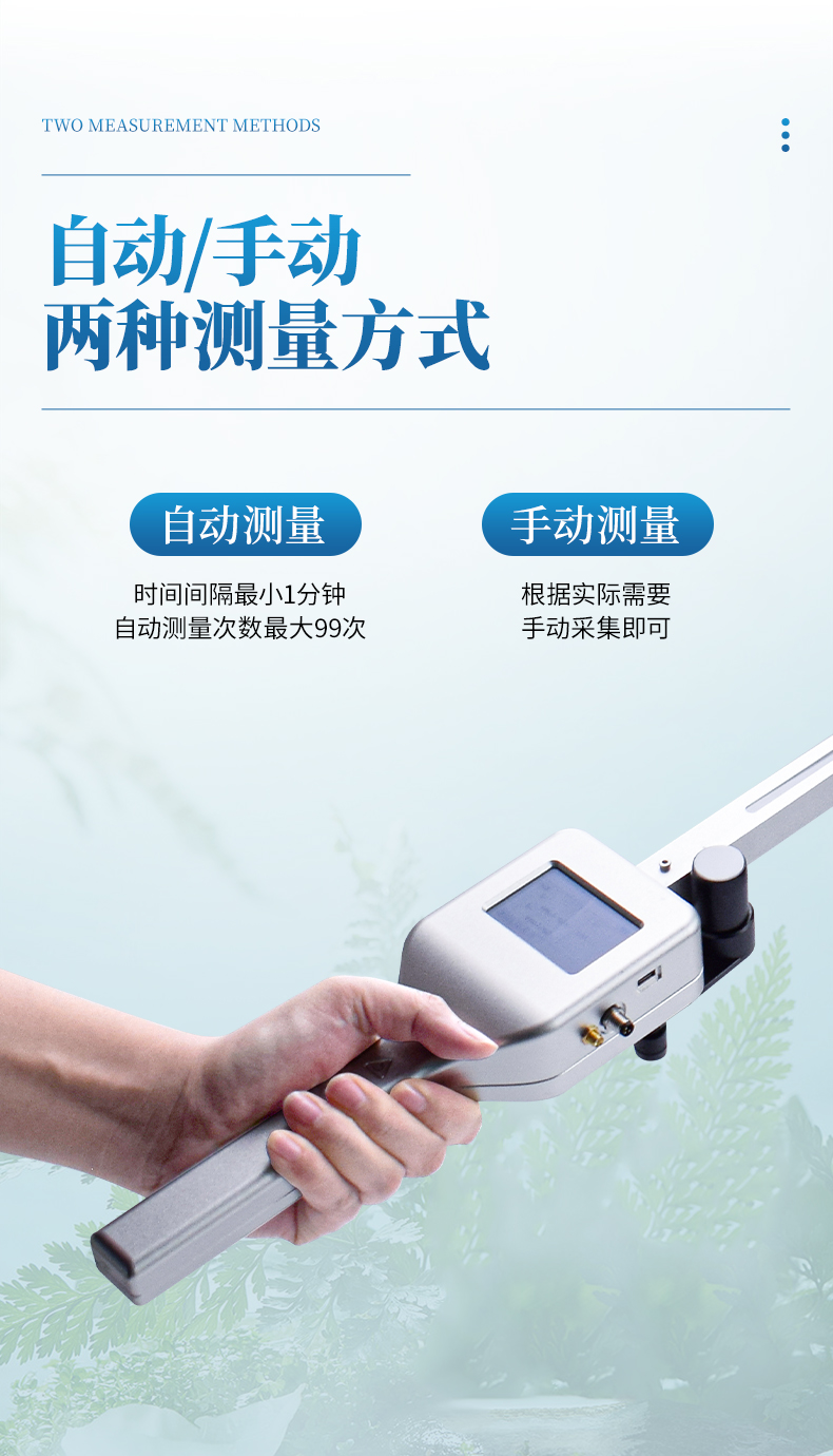 植物冠層測量儀為一體化設計,包括液晶顯示屏、操作按鍵、存儲SD卡及測量探桿等。儀器菜單操作簡單,體積小,攜帶方便。存儲介質為市場上通用的SD卡,存儲容量大,數據管理方便!在功耗上有合理的電源管理方案,測試過程中儀器根據實際情況自動進入待機狀態,需要時按喚醒鍵即可喚醒屏幕,觀察實際數據。測量方式分為自動和手動兩種。自動測量時間間隔最小1分鐘,自動測量次數最大99次,手動測量根據實際需要手動采集即可。
