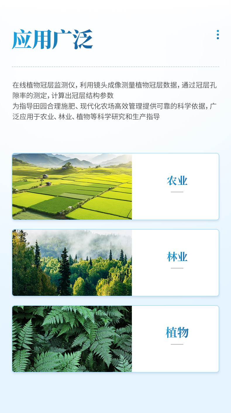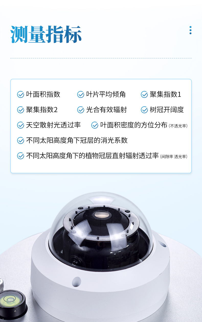 在線植物冠層監測儀是一款用于實時監測植物冠層狀態的設備,利用魚眼鏡頭成像測量植物冠層數據,通過冠層孔隙率的測定,計算出冠層結構參數;這是目前世界上各種冠層儀一致采用的原理,該方法是各類方法中精確、省力、省時、快捷方便的方法。為指導田園合理施肥、現代化農場高效管理提供可靠的科學依據,廣泛應用于農業、林業、植物等科學研究和生產指導。