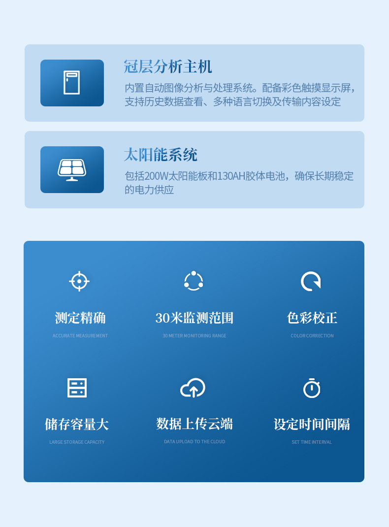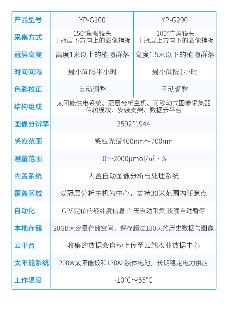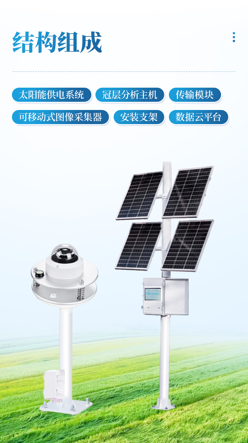 太陽能供電系統、冠層分析主機、可移動式圖像采集器(含150°魚眼鏡頭)、傳輸模塊、安裝支架、數據云平臺