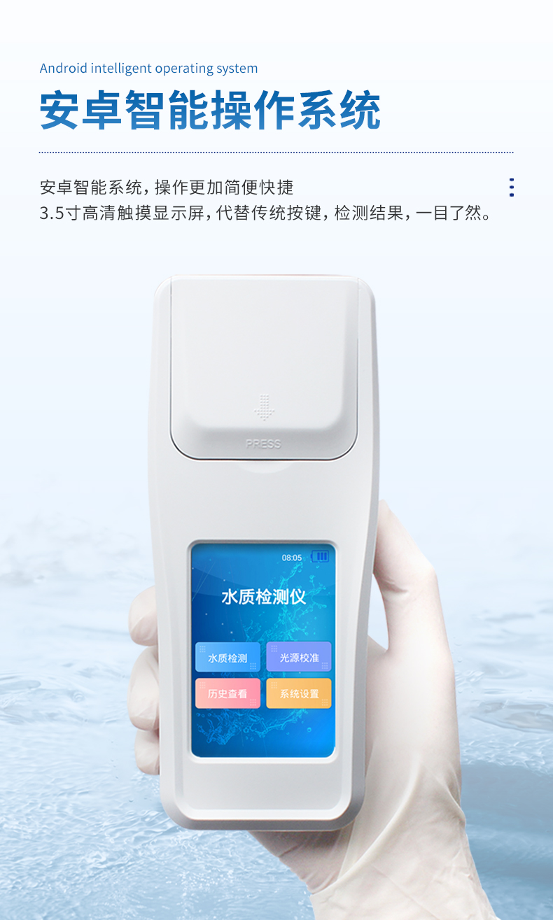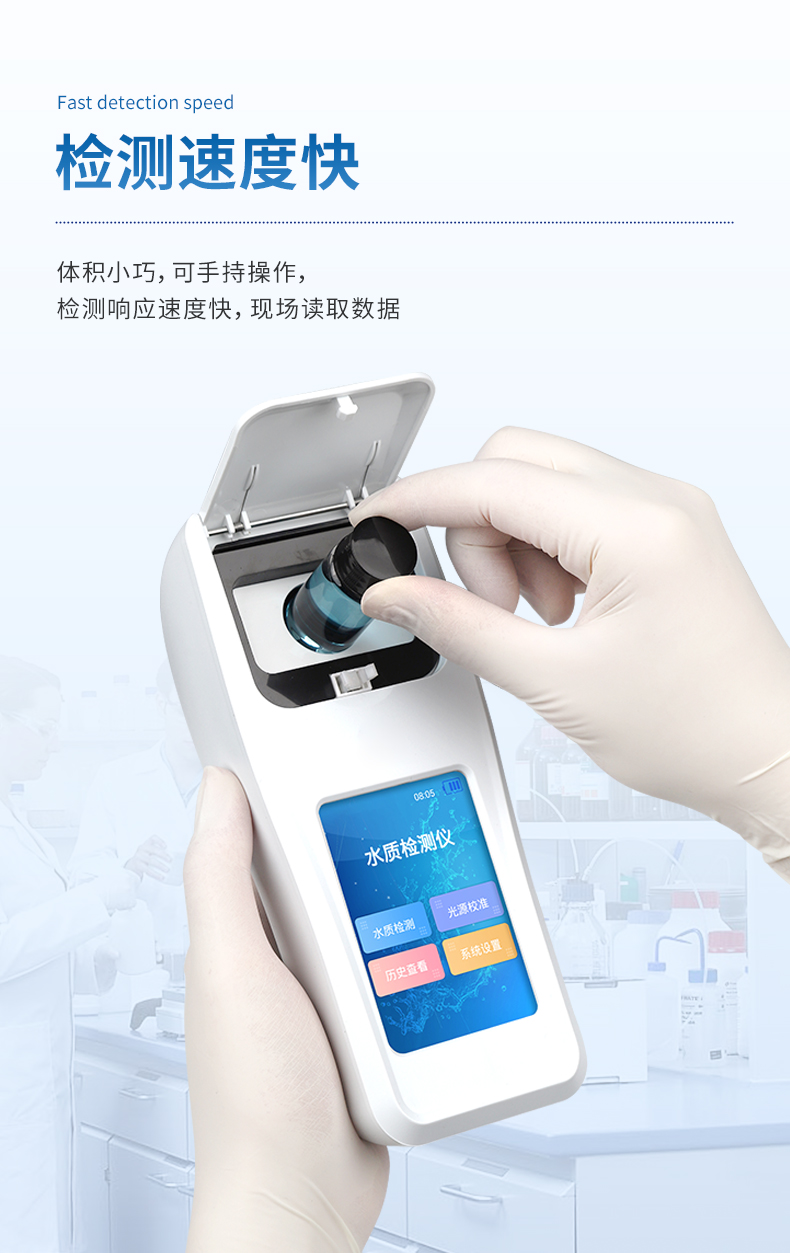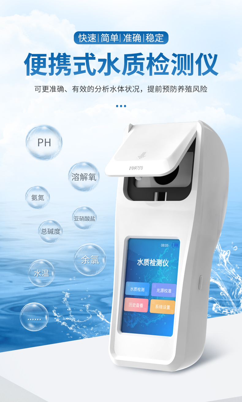 便攜式多參數水質檢測儀是一款適用于純凈水廠、自來水廠、生活污水處理廠、工業污水、水產養殖、河流監測、游泳場館、水源保護、生產監測、科研實驗等領域的檢測儀,配合快速顯色檢測試劑,可“快速、簡單、準確、穩定”進行測量,擁有精美的外觀造型,簡單的操作界面,準確的檢測系統,幫助用戶獲得精細的數據,可更準確、有效的分析水體狀況。