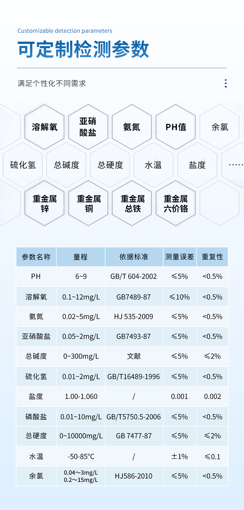 余氯、總氯、有效氯、氨氮、溶解氧、pH、濁度、懸浮物、二氧化氯、臭氧、尿素、色度、氯化物、氰尿酸、硫化氫、亞硝酸鹽、磷酸鹽、總硬度、總堿度、水溫、鹽度等20多種檢測指標任選10種;