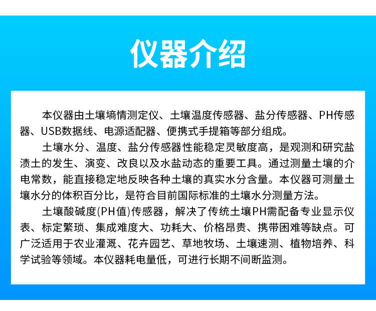土壤水分測定儀采用FDR頻域反射原理,快速準確測量土壤中含水量,可對多處樣地、不同土壤深度的水分含量進行快速檢測和長期連續監測。廣泛應用于土壤墑情檢測、旱作節水灌溉、精細農業、林業、地質勘探、植物培育等領域。