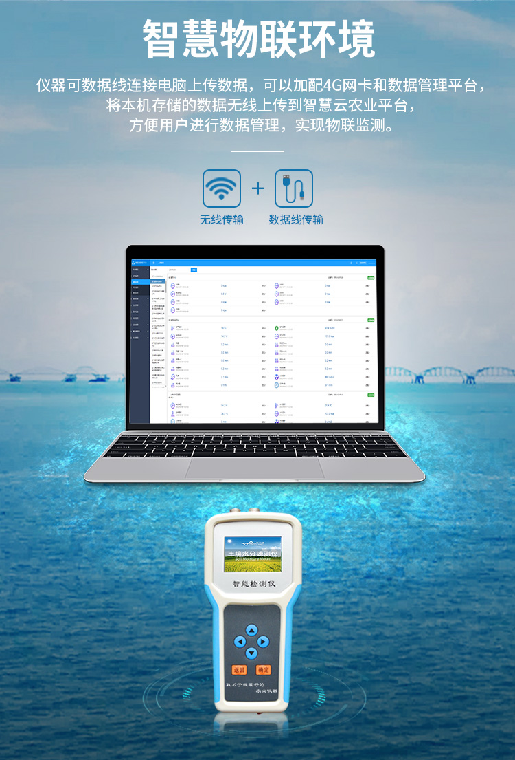 1、☆儀器可加配4G聯網功能和數據管理平臺,將本機存儲的歷史數據無線上傳到智慧云農業平臺,方便用戶進行數據管理和長期分析。